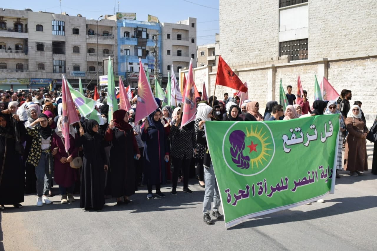Yürüyüşte, Türk devletinin Kuzey ve Doğu Suriye bölgesine yönelik bombardımanı ve Minbic, Til Rifet, Girê Spî ile Til Temir’in hedef alınması ve Başûrê Kurdistan’a yönelik saldırıları kınandı.