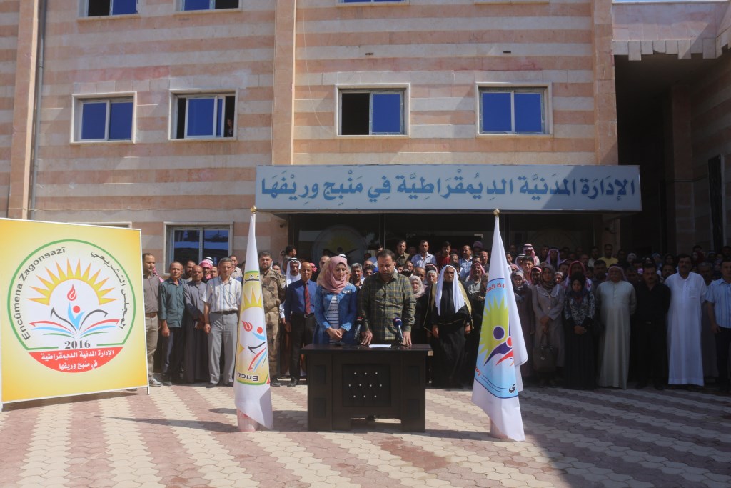 Demokratik Sivil Yönetim, kent özgürleştirilmeden önce kuruldu ve kentin kurtarılması kent sakinlerini yardımıyla gerçekleşti. Şimdi de Minbic’i yönetecek güç odur, kurulduktan sonra da çalışmalarını meclis ve çeşitli komiteler aracılığıyla sürdürdü. Kentte yaşayan yurttaşların dış güçlerin emirleri ve iç işlerine karışmasına ihtiyaçları yok.