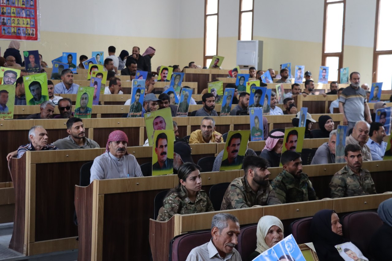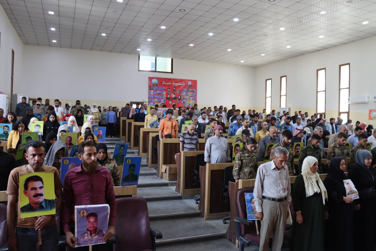 MINBIC- Minbic Kantonu Şehit Aileleri Meclisi, “Şehitlerin ruhuyla direnişini büyütüp, Önder Abdullah Öcalan’ın fiziki özgürlüğünü sağlayacağız” sloganıyla Minbic Kantonu Demokratik Halklar Meclisi salonunda bir tören düzenledi. Törene şehit aileleri, Minbic Demokratik Özerk Yönetimi kurum temsilcileri, İç Güvenlik Güçleri ve Zenûbiya Kadın Topluluğu katıldı.