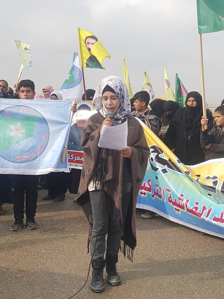 El-Kadro benzin istasyonu önünde toplanan katılımcıların ardından El-Kadro kavşağı önünde yürüyüşe geçildi ve varışta şehitlerin ruhları için bir dakikalık saygı duruşunda bulunuldu ve ardından duruma ilişkin konuşmalar yapıldı. Minbic Genç Kadınlar Birliği adına Miraj Mihemed konuştu: