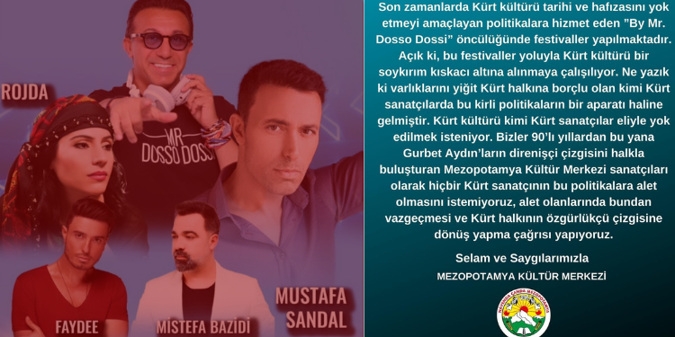 “Son zamanlarda Kürt kültürü tarihi ve hafızasını yok etmeyi amaçlayan politikalara hizmet eden “By Mr. Dosso Dossi” öncülüğünde festivaller yapılmaktadır. Açık ki bu festivaller yoluyla Kürt kültürü bir soykırım kıskacı altına alınmaya çalışılıyor. Ne yazık ki varlıklarını yiğit Kürt halkına borçlu olan kimi Kürt sanatçılar da bu kirli politikaların bir aparatı haline gelmiştir. Kürt kültürü kimi Kürt sanatçılar eliyle yok edilmek isteniyor. Bizler 90’lı yıllardan bu yana Gurbet Aydınların direnişçi çizgisini halkla buluşturan Mezopotamya Kültür Merkezi sanatçıları olarak hiçbir Kürt sanatçısının bu politikalara alet olmasını istemiyoruz, alet olanların da bundan vazgeçmesi ve Kürt halkının özgürlükçü çizgisine dönüş yapma çağrısı yapıyoruz. “