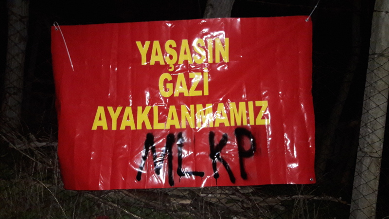 Gazi Mahallesi’nde yapılan çalışmada, “Yaşasın Gazi ayaklanmamız – MLKP” yazılamalarının yanı sıra aynı sloganın yer aldığı pankart asıldı.