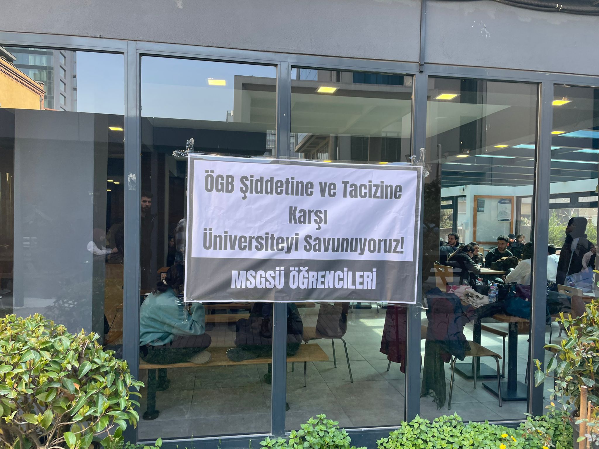 İSTANBUL- Mimar Sinan Güzel Sanatlar Üniversitesi (MSGSÜ) öğrencileri bugün (18 Mart) Bomonti Kampüsünde özel güvenliklerin şiddet ve tacizine karşı eylem yaptı. Üniversiteliler “ÖGB şiddetine ve tacizine karşı üniversiteyi savunuyoruz!” yazılı pankart açarak yürüdü.