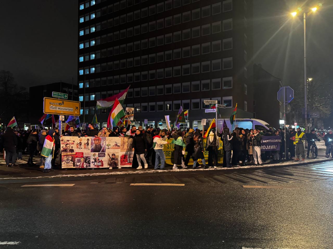 Eylem, TCŞ Münster Gençliği, Kadın Hareketi, Yerel Meclis ve enternasyonal Kürt dostlarının öncülüğünde, Merkez Tren İstasyonu (HBF) önünde başladı. Yoğun katılımın olduğu eylemde gençlik ve kadınların öncülüğü dikkat çekti.