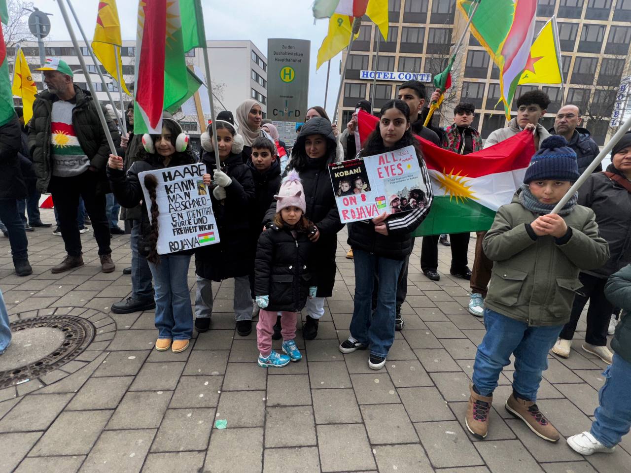 Yürüyüş boyunca ise gençlerin sesi hiç dinmedi. Gençler sık sık, “Bijî Berxwedana Rojava”, “Yekê yekê yekê gelê Kurd yek e” ve “Bijî Berxwedana Kobanê” sloganları ile Münster sokaklarını inletti.