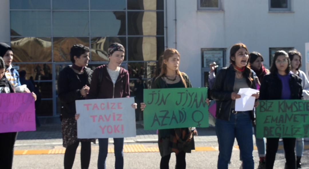 Arkadaşları adına açıklama yapan üniversite öğrencisi Dilar Aras, ”Kadınlar olarak hayatımızın her alanında tacize, tecavüze ve şiddete maruz bırakılıyoruz. Son dönemlerde artan şiddet, taciz, tecavüz ve katliamlar, ne yazık ki akademilerde azımsanmayacak oranda artış göstermektedir” dedi.