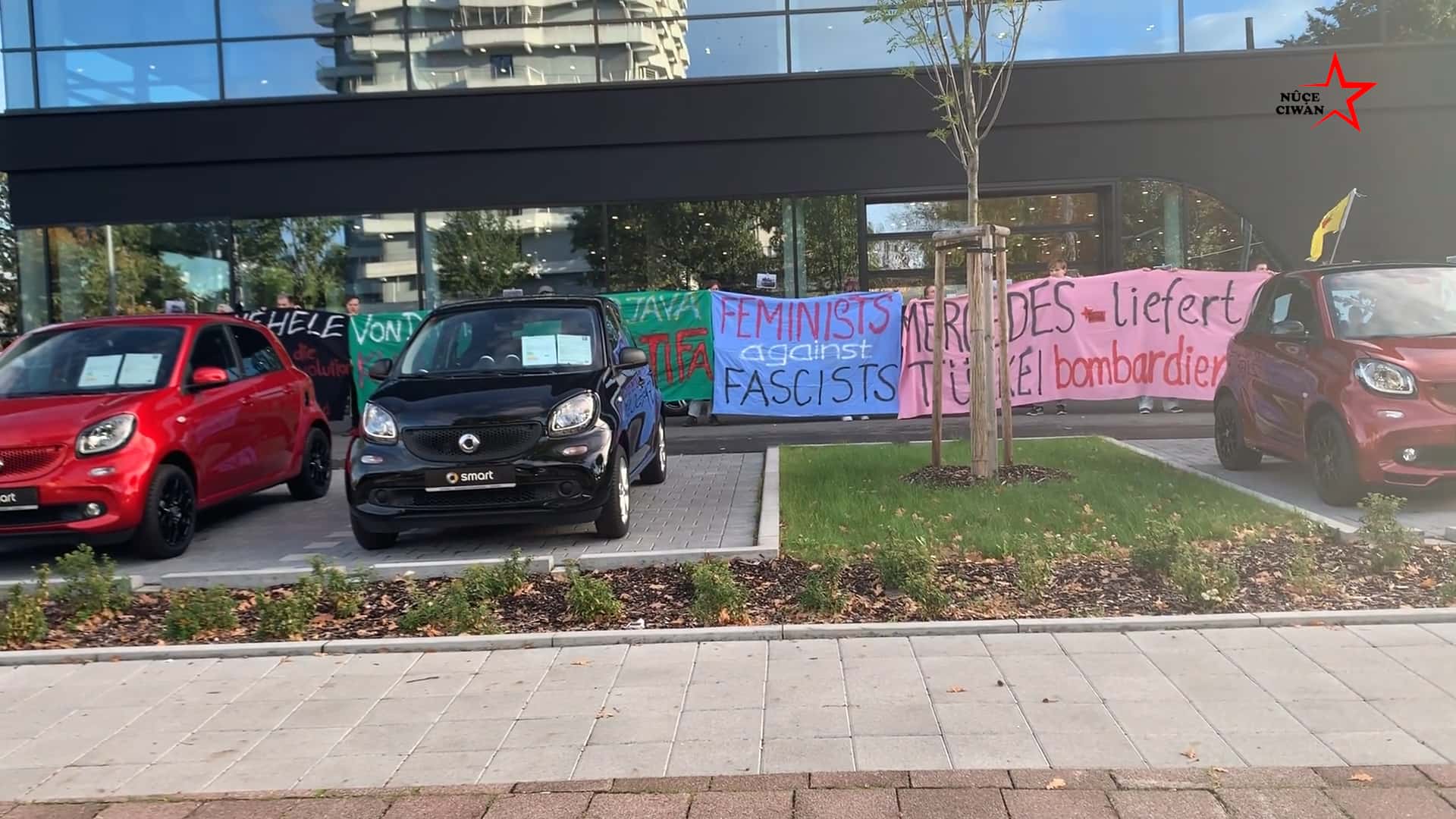 DARMSTADT – Gençlik hareketlerinin ortak düzenlediği eylemde Almanya’nın Darmstadt şehrinde Mercedes şirketine bir eylem düzenlendi. Faşist Türk devletinin işgal ordusuna askeri araç sağlayan Mercedes şirketinin binasının girişi önünde toplanan onlarca aktivist hazırladıkları pankartlarla bina girişini uzun süre işgal etti. Gençler bu eylemleriyle Mercedes’in işgalci Türk ordusuna verdiği lojistik desteği çekmesini talep ettiler.