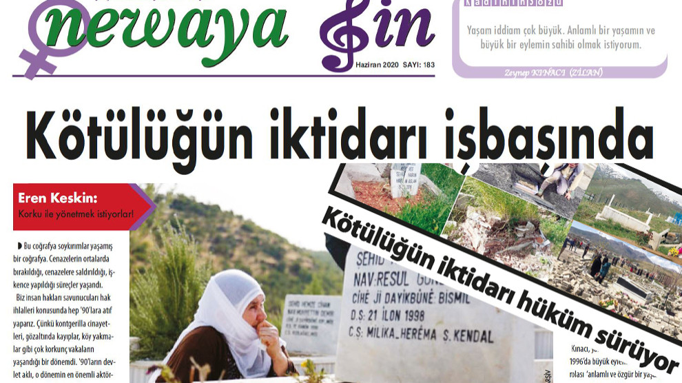 HABER MERKEZİ- Newaya Jin kadın gazetesinin Haziran sayısında, mezarlıklara saldırılar, Kürt Özgürlük Hareketi’nin sembol isimlerinden Zeynep Kınacı’nın 30 Haziran 1996’da gerçekleştirdiği eylemin anlattıkları, Gülistan Doku, Ulusal Birlik girişimleri, doğa kırımına karşı mücadele gibi gündemlere, portre ve anı türü makalelere yer verildi.