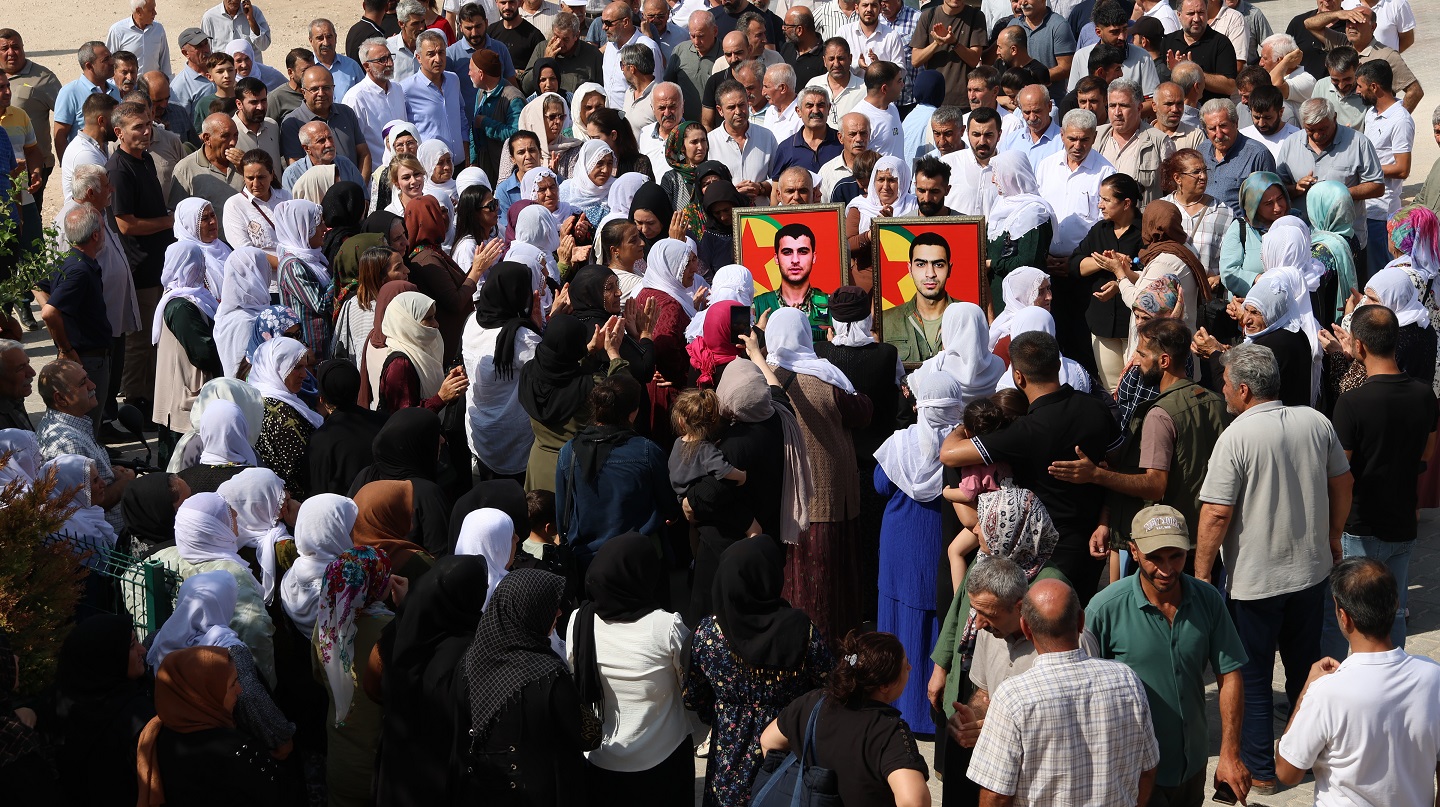 Yeni Hal Kavşağı’ndan Dicle Taziye Evi’ne yürüyen halk, Demir ve Tutal’ın fotoğraflarını taşıyarak “Şehîd namirin” ve “Bijî Serok Apo” sloganları attı. Taziye evinde saygı duruşunun ardından Çarxa Şoreşê marşı okundu.