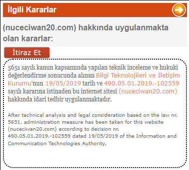 “5651 sayılı kanun kapsamında yapılan teknik inceleme ve hukuki değerlendirme sonucunda alınan Bilgi Teknolojileri ve İletişim Kurumu‘nun 19/05/2019 tarih ve 490.05.01.2019.-102559 sayılı kararına istinaden bu internet sitesi (nuceciwan20.com)hakkında idari tedbir uygulanmaktadır.”