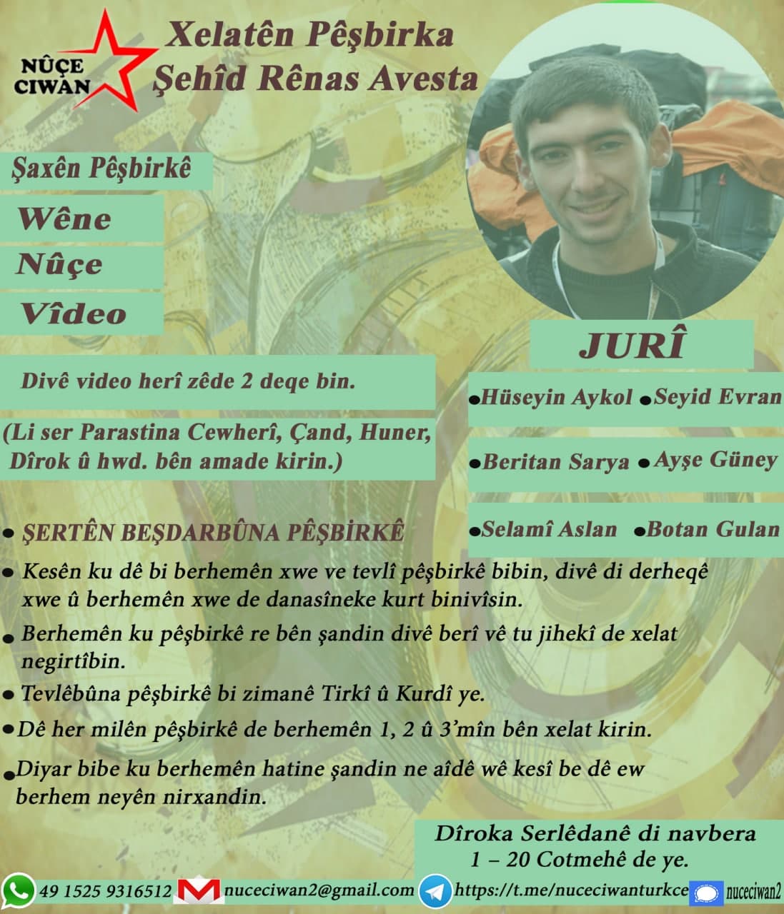 Yarışmaya katılım başvuruları 1 – 20 Ekim tarihleri arasında olacaktır. Haberlerin resmi Nûçe Ciwan iletişim adresleri üzerinden veya elden bizzat teslim edilmesi gerekiyor.
