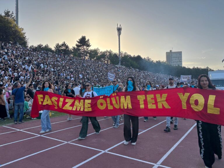 Türkiye devrimci hareketinin önderlerinin fotoğraflarının da taşındığı yürüyüşte Filistin mücadelesine, aile politikaları adı altında yürütülen kadın düşmanlığına ve kadına yönelik şiddete, kayyum rektörlerin uyguladığı keyfi yasaklara ve baskılara dikkat çeken pankart, döviz ve sloganlar öne çıktı.