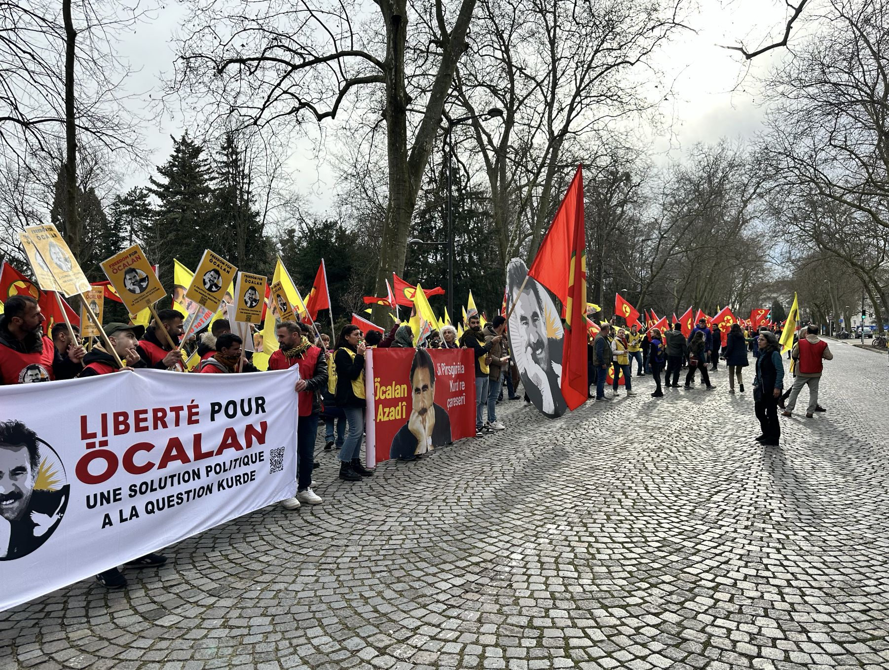 Kürtçe, İngilizce ve Fransızca açıklamalar yapan yürüyüşçüler, Önder APO’nun fiziki özgürlüğünü dile getirdiler. Önder APo’nun fiziki özgürlüğünün tüm halkarın ve başta Kürt halkının özgürlüğü olduğunu belirti.