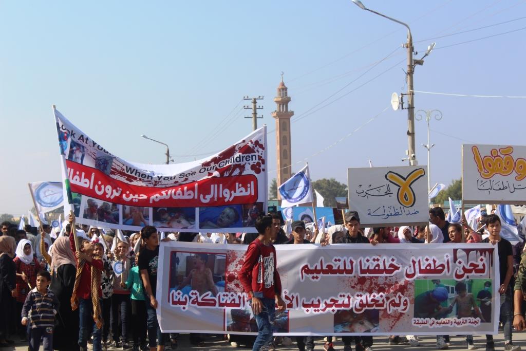 TEBQA – Tebqa’da yüzlerce öğretmen ve öğrenci, gerçekleştirdikleri kitlesel yürüyüş ile işgalci Türk devletinin işgal saldırılarını protesto etti. Tebqa Kadın Evi önünde bir araya gelen kitle, “Çocukların katledilmesine hayır” yazılı pankart ile işgal saldırılarında şehit düşenlerin fotoğrafları ile yürüyüşe geçti.