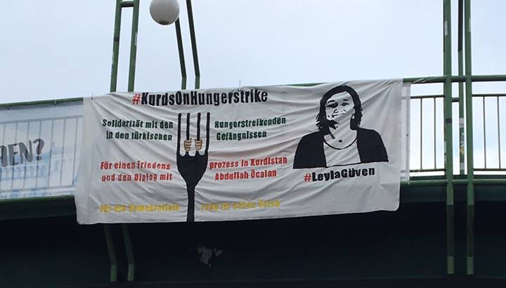 Kürdistanlı öğrenciler birliği YXK Almanya’nın Hannover şehrinde merkezi bir köprü üzerine Leyla Güven’in eylemine ve tecride dikkat çekmek için büyük bir pankart astı.