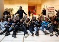 Binaya girişi engelleyen yaklaşık 140 öğrenci, enerji sektöründeki iştiraklerinin iklim değişikliğine yol açtığı gerekçesiyle bankayı protesto ediyor.Bankanın girişine, “İklim krizinin finansörleri” yazılı pankartlar da asıldı.