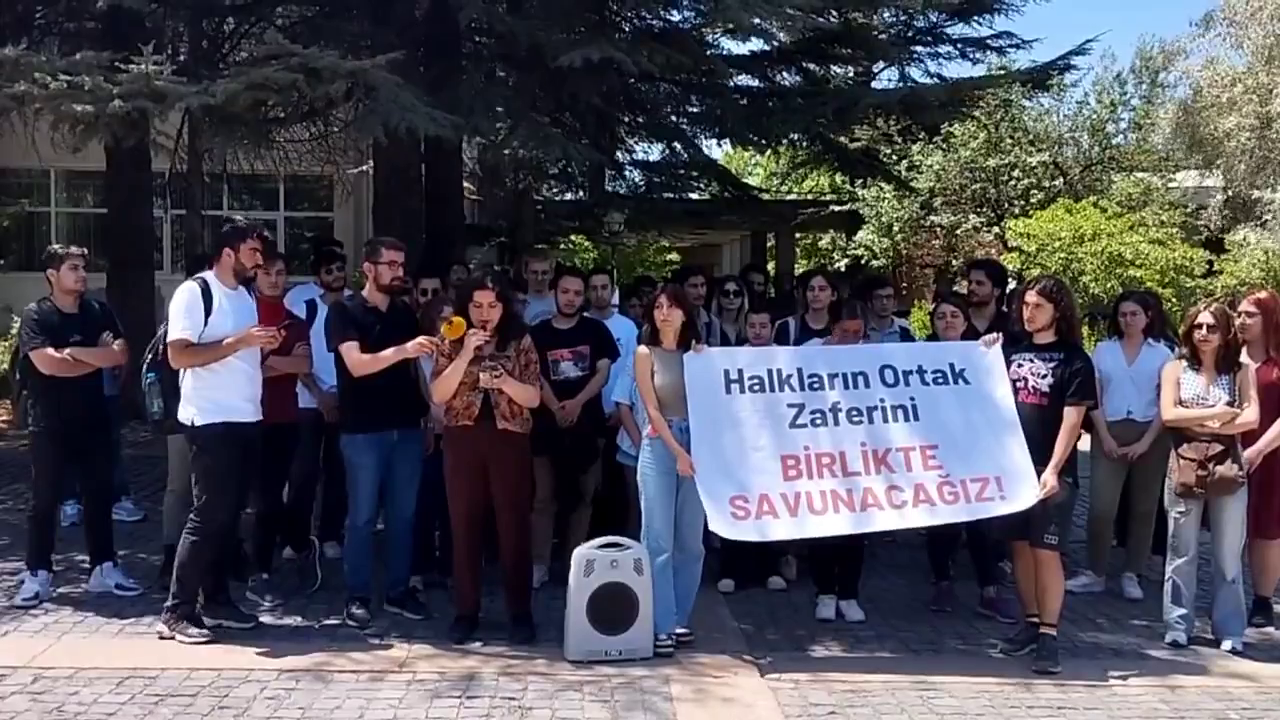 HABER MERKEZİ- ODTÜ ( Ortadoğu Teknik Üniversitesi ) Öğrencileri gerçekleştirdikleri basın açıklaması ile Kobane kumpas davasında siyasetçilere verilen cezaları, AKP-MHP sömürgeci ekonomi politikalarını ve Kürt halkına karşı savaşta ısrar etmesini, halkın bütçesinin silaha yatırılmasını, 1 Mayısta Taksimde tutuklananlar, Dünyanın dört bir yanında Filistin için direnip gözaltına alınan ve tutuklanan tüm üniversite gençliği ve tüm devrimci tutsaklar selamlandı. Eşitlik, barış ve özgürlük mücadelemizi büyüteceğiz vurgusu yapılarak basın açıklaması gerçekleştirildi.
