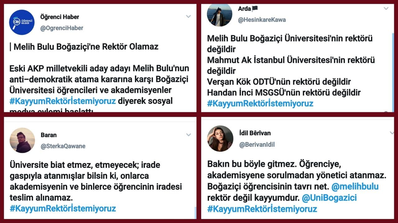 İstanbul Boğaziçi Üniversitesine Melih Bulu'nun rektör olarak atanmasının ardından üniversite öğrencilerini sanal medya da oluşturdukları #KayyumRektörİstemiyoruz hashtag'ı ile tepkilerini dile getirdiler.