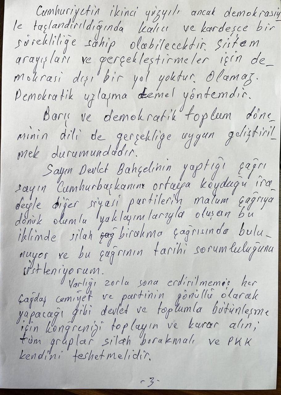 Varlığı zorla sona erdirilmemiş her çağdaş cemiyet ve partinin gönüllü olarak yapacağı gibi devlet ve toplumla bütünleşme için kongrenizi toplayın ve karar alın; tüm gruplar silah bırakmalı ve PKK kendini feshetmelidir.