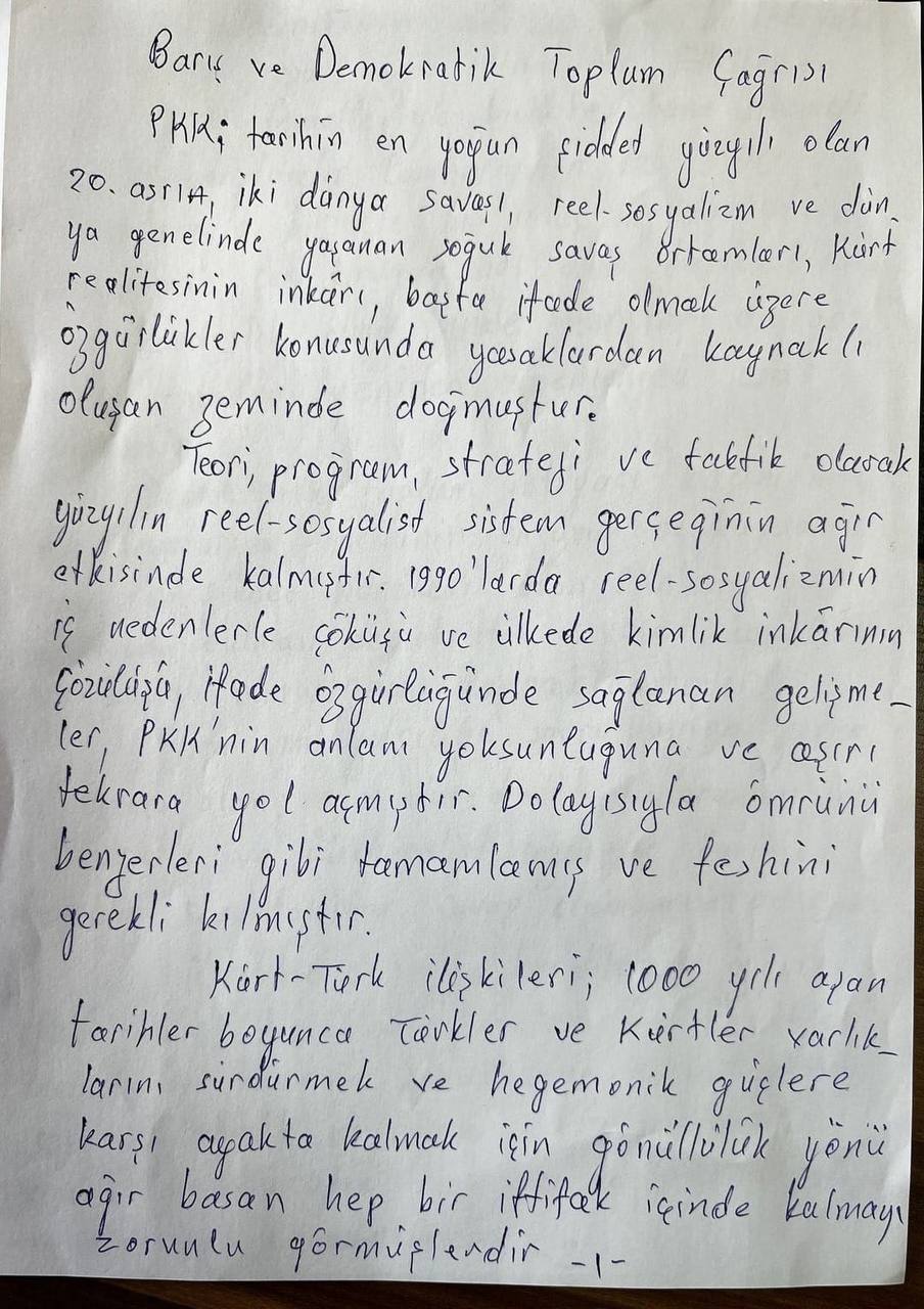 Önder APO “Barış ve Demokratik Toplum” çağrısı yaptı. Önder APO’nun çağrısı şöyle: