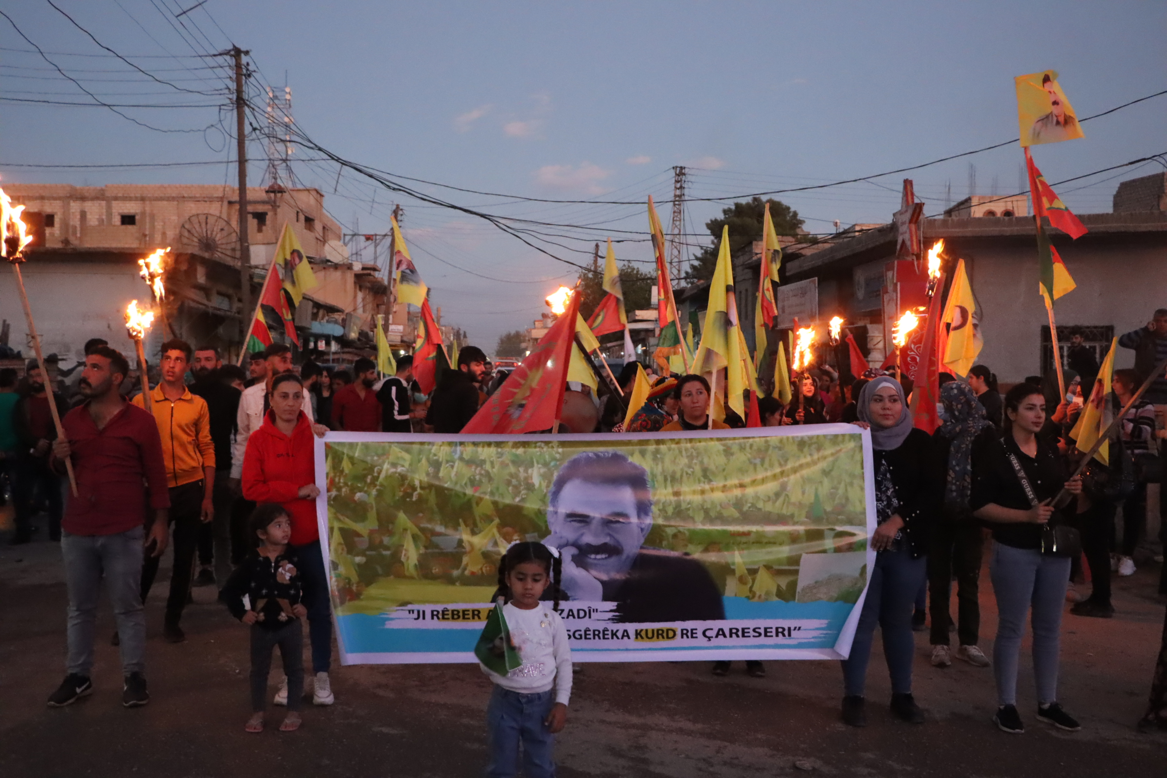 QAMIŞLO- Önder Apo’ya Özgürlük, Kürt sorununa çözüm” girişimi kapsamında Tirbespiye ilçesinde Suriye Devrimci Gençlik Hareketi üyeleri ve Genç Kadınlar Birliği üyeleri meşaleli yürüyüş düzenledi. Yürüyüş eğitim merkezinin önünden başladı. Yürüyüşte Önder Apo’nun’ın fotoğraflarının olduğu bayraklar kaldırıldı ve “Kahrolsun Komplocu güçler, yaşasın İmralı direnişi” yazılı pankartlar açıldı.