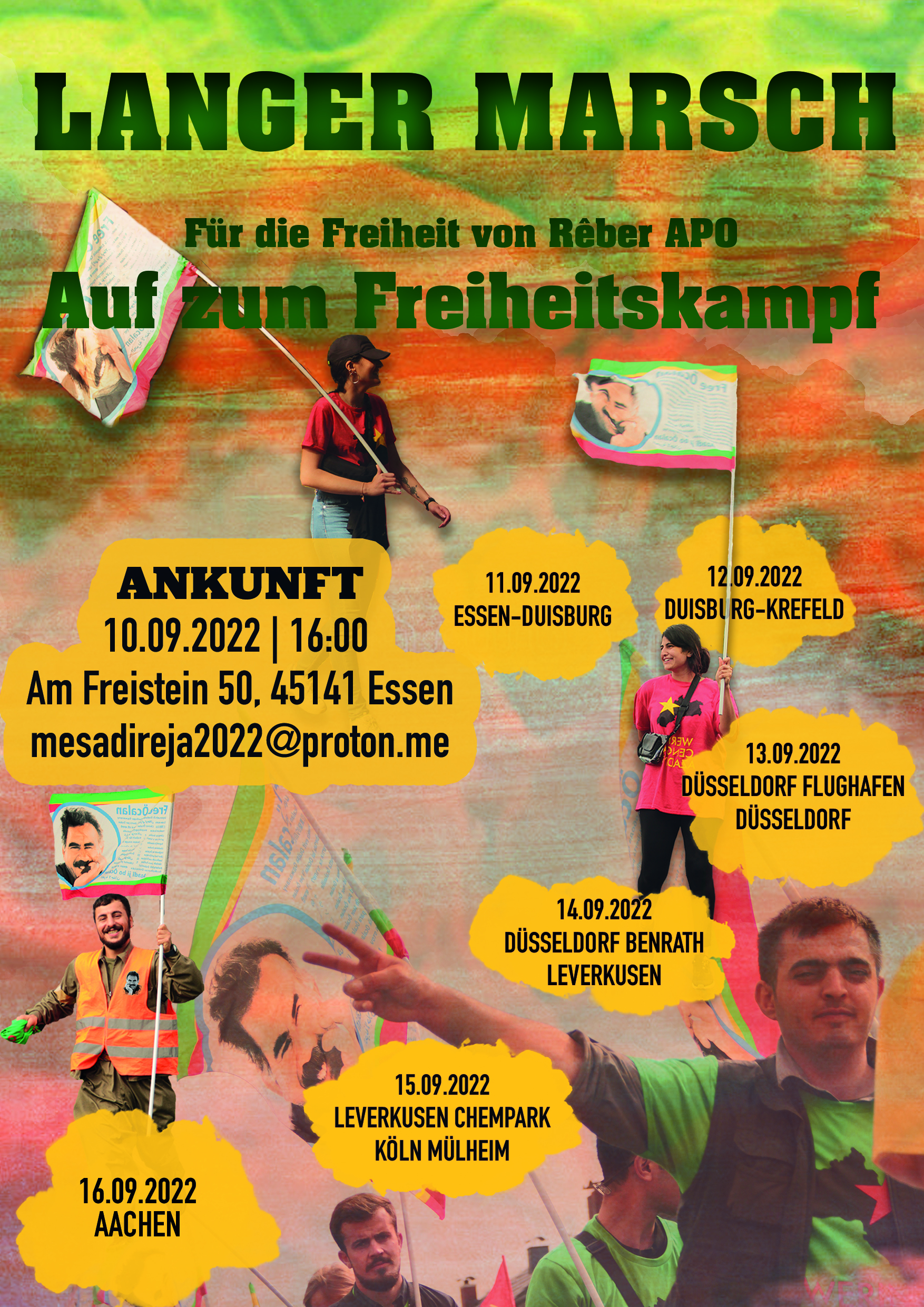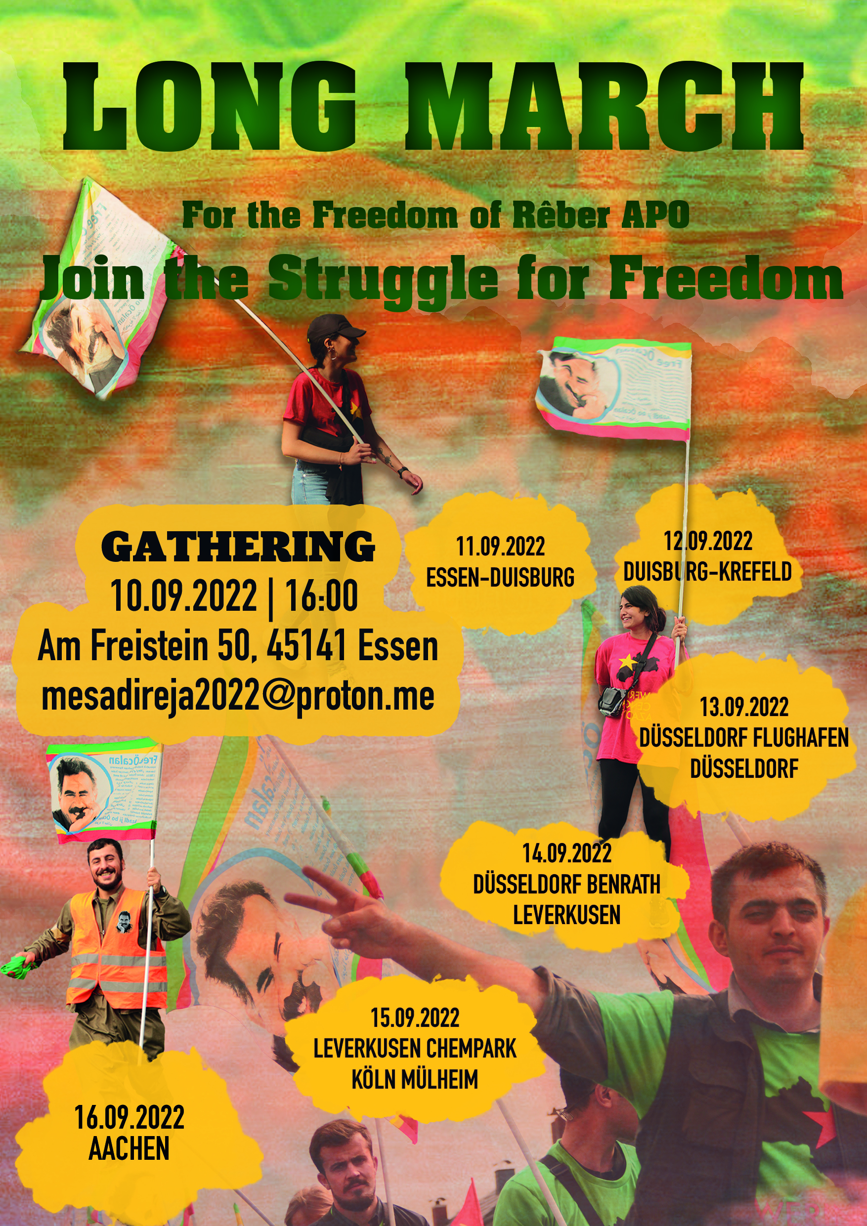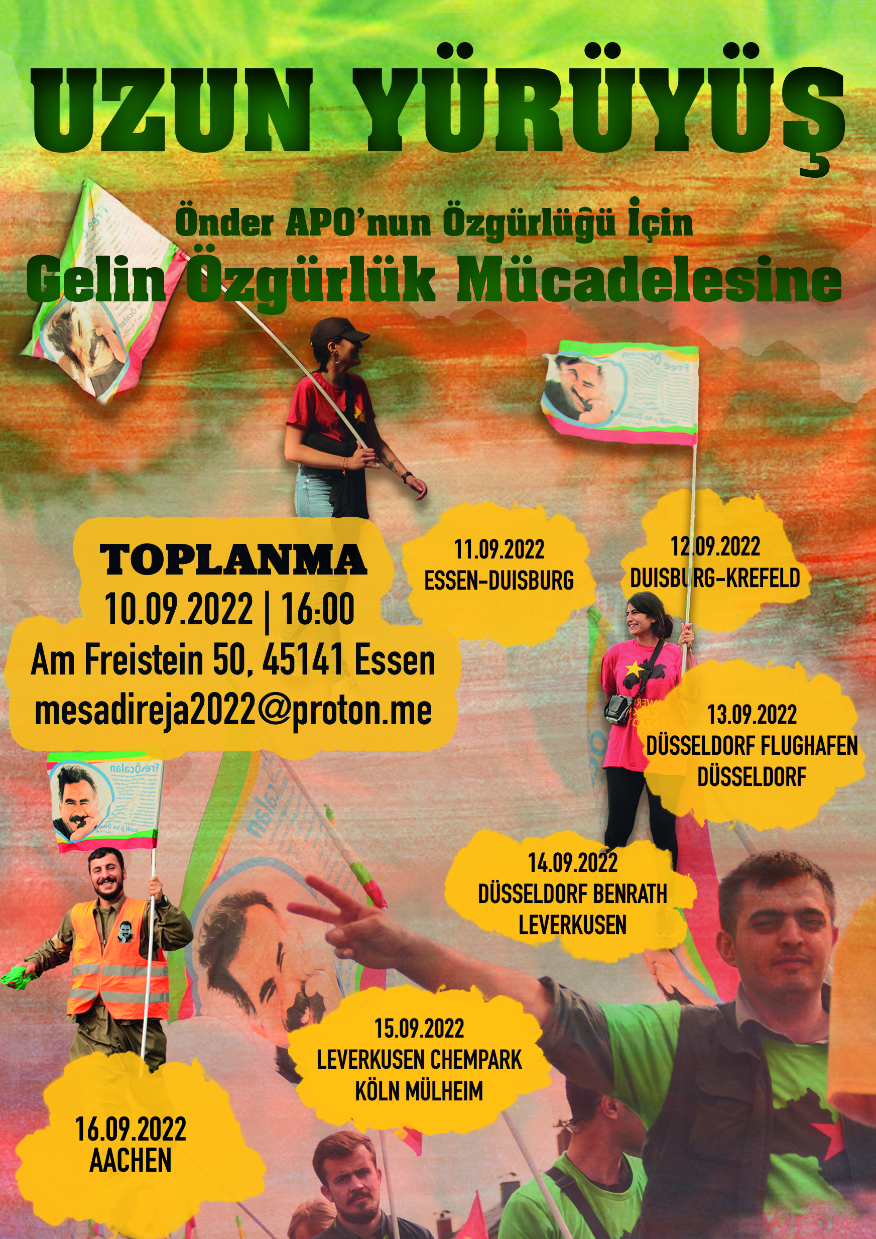 HABER MERKEZİ – Halklar Önderi Önder APO şahsında uygulanan ağır tecrit ve işkence sistemine karşı 11-16 Eylül 2022 tarihlerinde, Almanya’da, “Önder APO’ya Özgürlük için, Gelin Özgürlük Mücadelesine” şiarıyla uzun yürüyüş gerçekleştiriliyor.