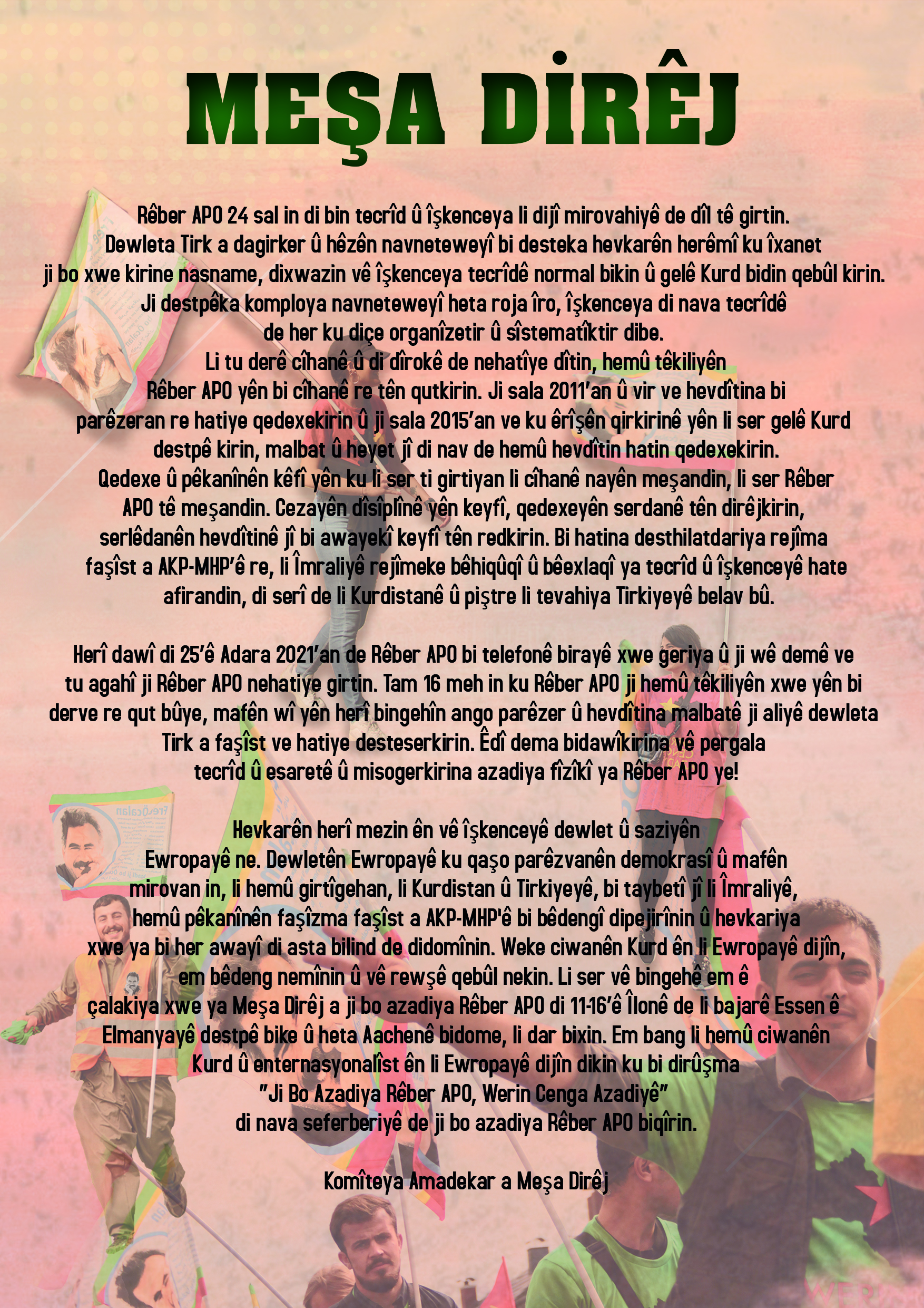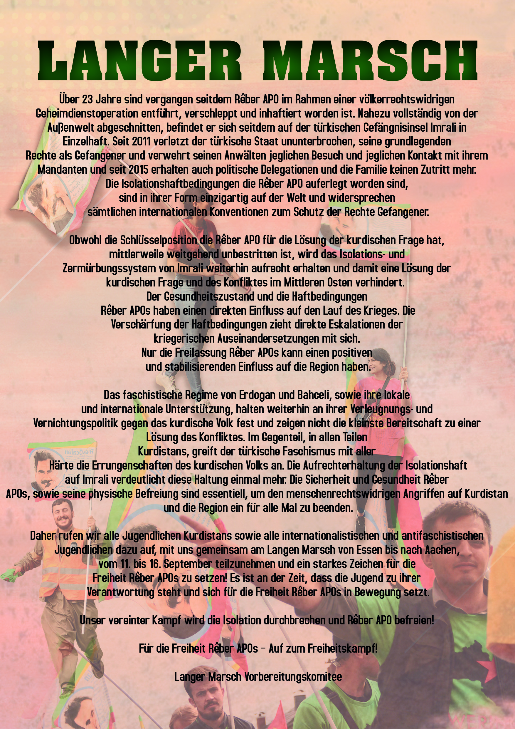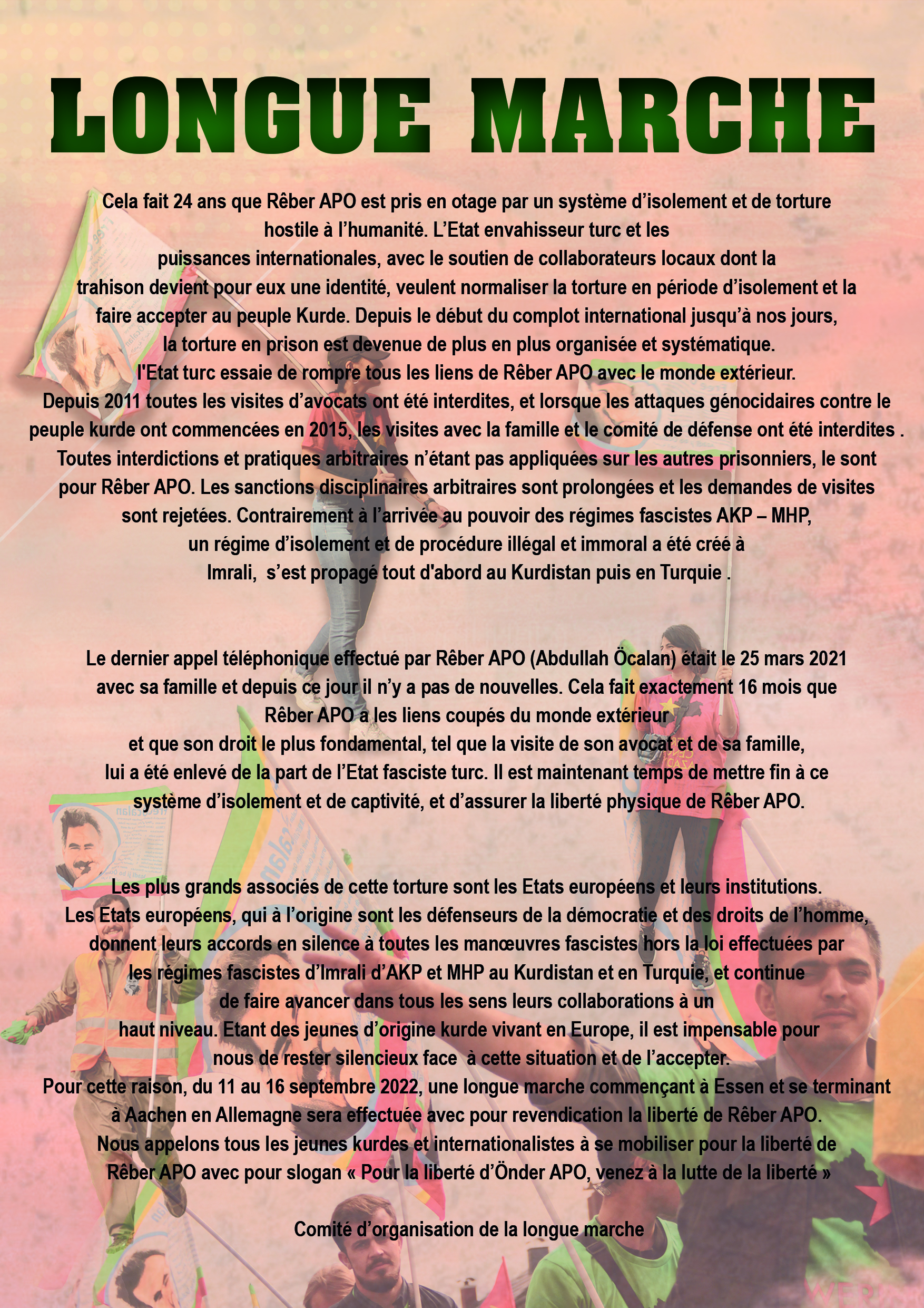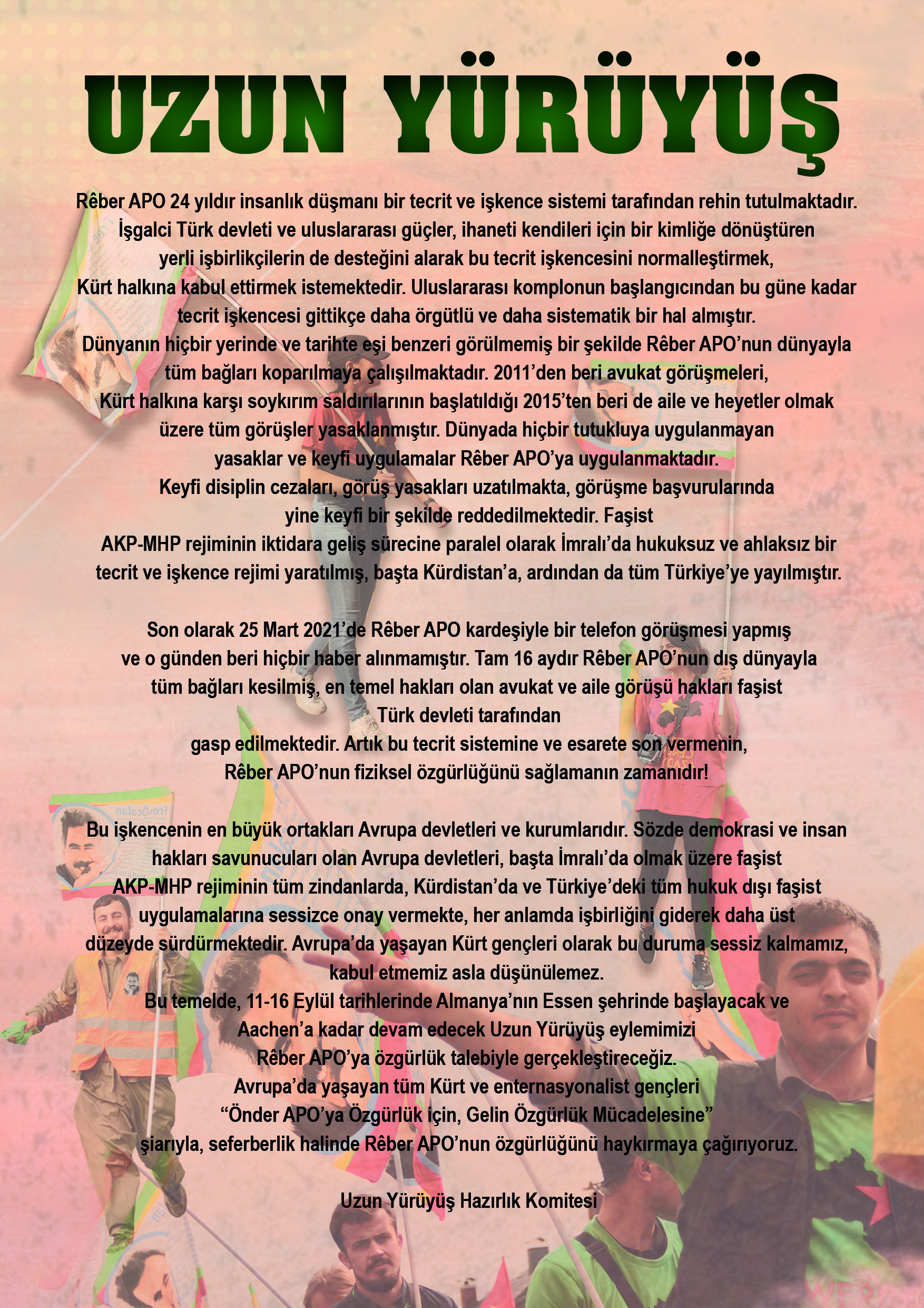 Yürüyüşe ilişkin bir açıklamayla çağrıda bulunan uzun yürüyüş hazırlık komitesi, ağır tecrit ve işkence sistemine, uygulanan yasak ve keyfi uygulamalara karşı Avrupa’da yaşayan tüm Kürt ve enternasyonalist gençleri “Önder APO’ya Özgürlük için, Gelin Özgürlük Mücadelesine” şiarıyla, seferberlik halinde Rêber APO’nun özgürlüğünü haykırmaya çağırıyoruz, diye belirttiler.