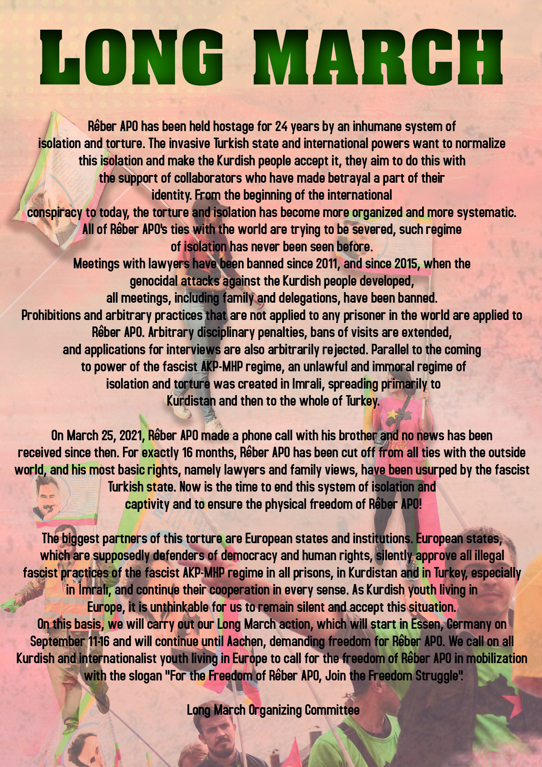 Bu işkencenin en büyük ortakları Avrupa devletleri ve kurumlarıdır. Sözde demokrasi ve insan hakları savunucuları olan Avrupa devletleri, başta İmralı’da olmak üzere faşist AKP-MHP rejiminin tüm zindanlarda, Kürdistan’da ve Türkiye’deki tüm hukuk dışı faşist uygulamalarına sessizce onay vermekte, her anlamda işbirliğini giderek daha üst düzeyde sürdürmektedir. Avrupa’da yaşayan Kürt gençleri olarak bu duruma sessiz kalmamız, kabul etmemiz asla düşünülemez. Bu temelde, 11-16 Eylül tarihlerinde Almanya’nın Essen şehrinde başlayacak ve Aachen’a kadar devam edecek Uzun Yürüyüş eylemimizi Rêber APO’ya özgürlük talebiyle gerçekleştireceğiz. Avrupa’da yaşayan tüm Kürt ve enternasyonalist gençleri “Önder APO’ya Özgürlük için, Gelin Özgürlük Mücadelesine” şiarıyla, seferberlik halinde Rêber APO’nun özgürlüğünü haykırmaya çağırıyoruz.