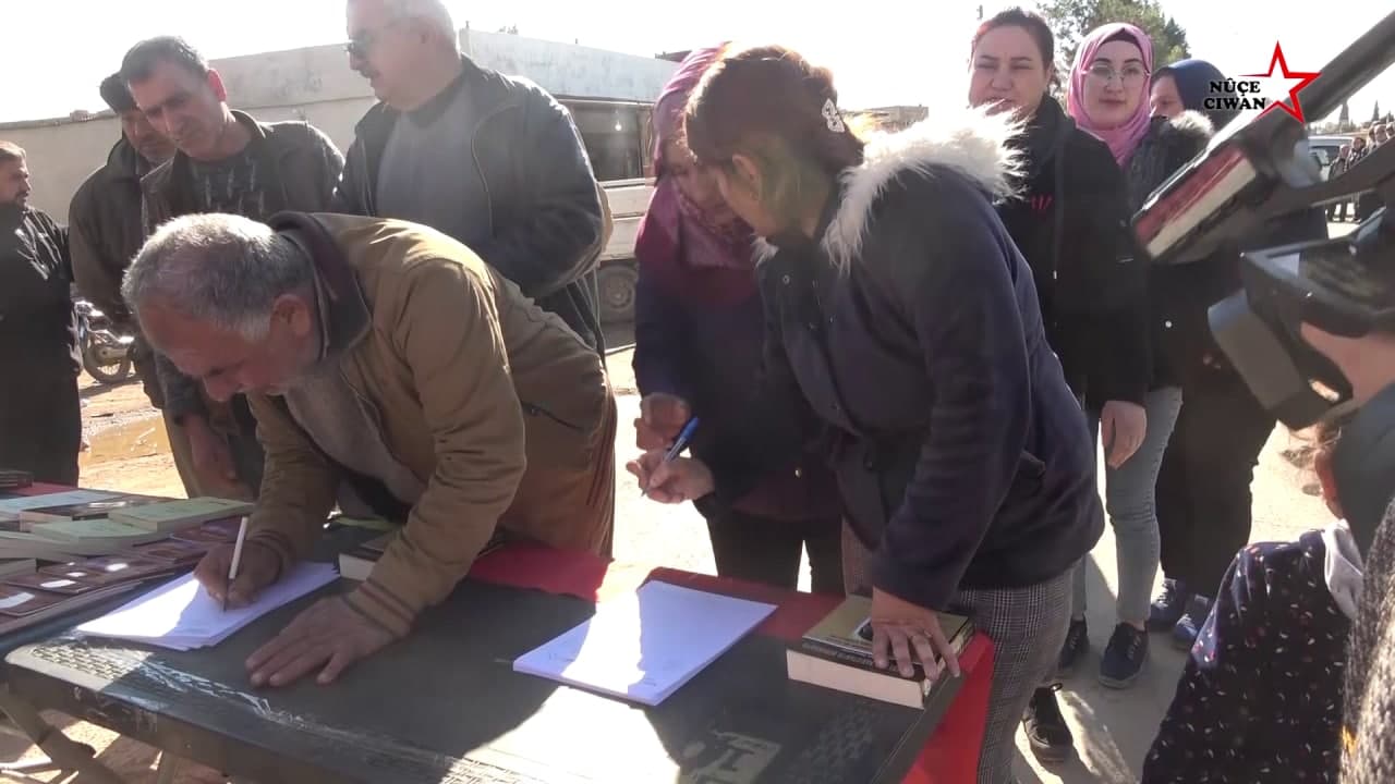 Konuşma ardından yüzlerce Girbawî sakini PKK’nin ‘terör listesi’nden çıkarılması için imza attı ve imza atanlara Önder Öcalan’ın kitabı da verildi.