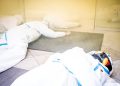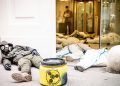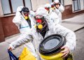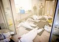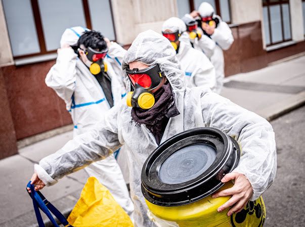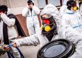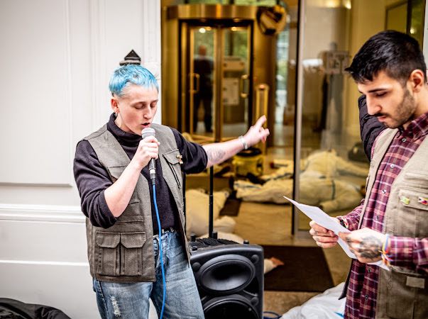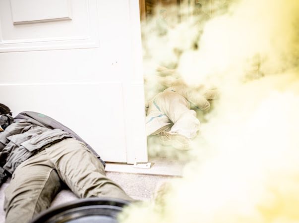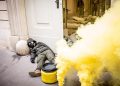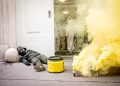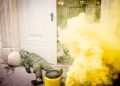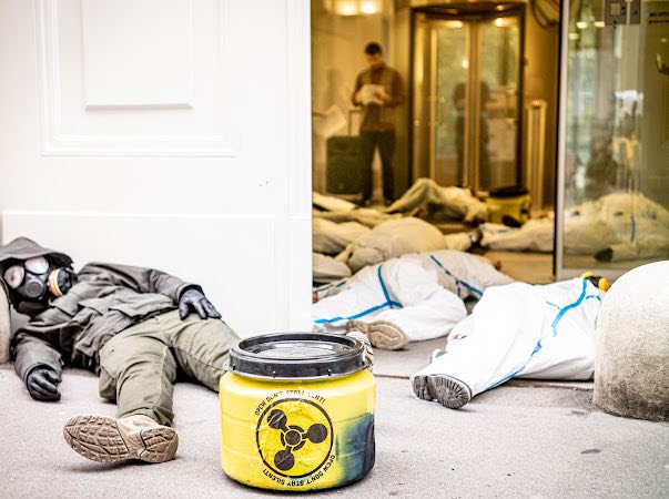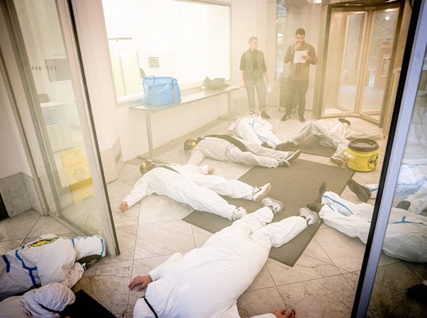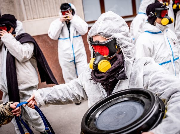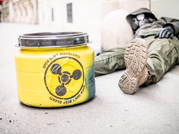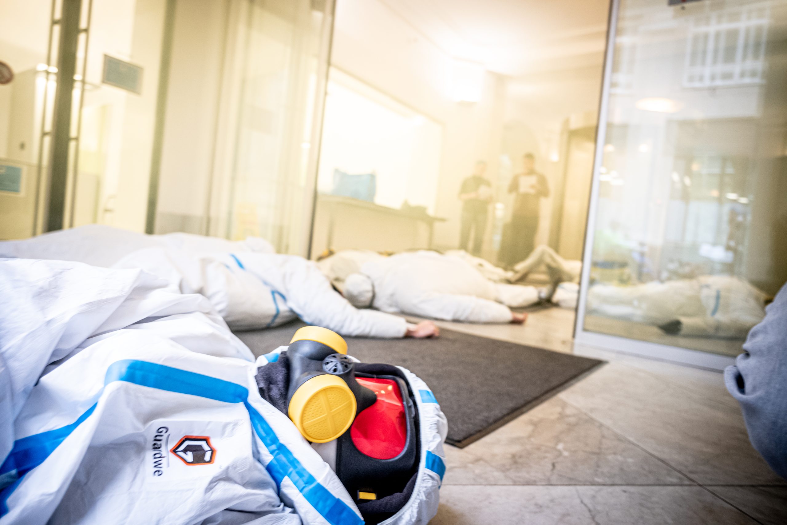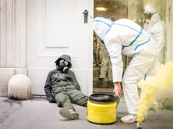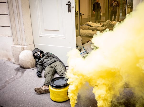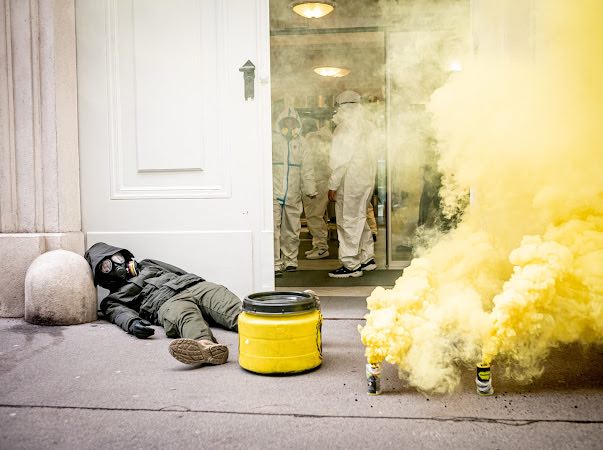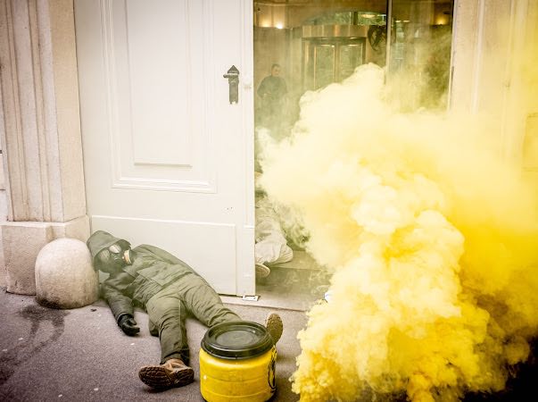 AGİT binası içerisinde ve dışında eylem gerçekleştiren gençler, kimyasal silah kullanımına dikkat çekmek için sarı dumanlar ve beyaz tulumlar giydi.