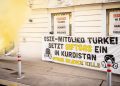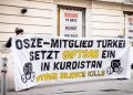 Bina önünde “AGİT üyesi Türkiye, Kurdistan’da kimyasal gaz kullanıyor” pankartı açıldı.