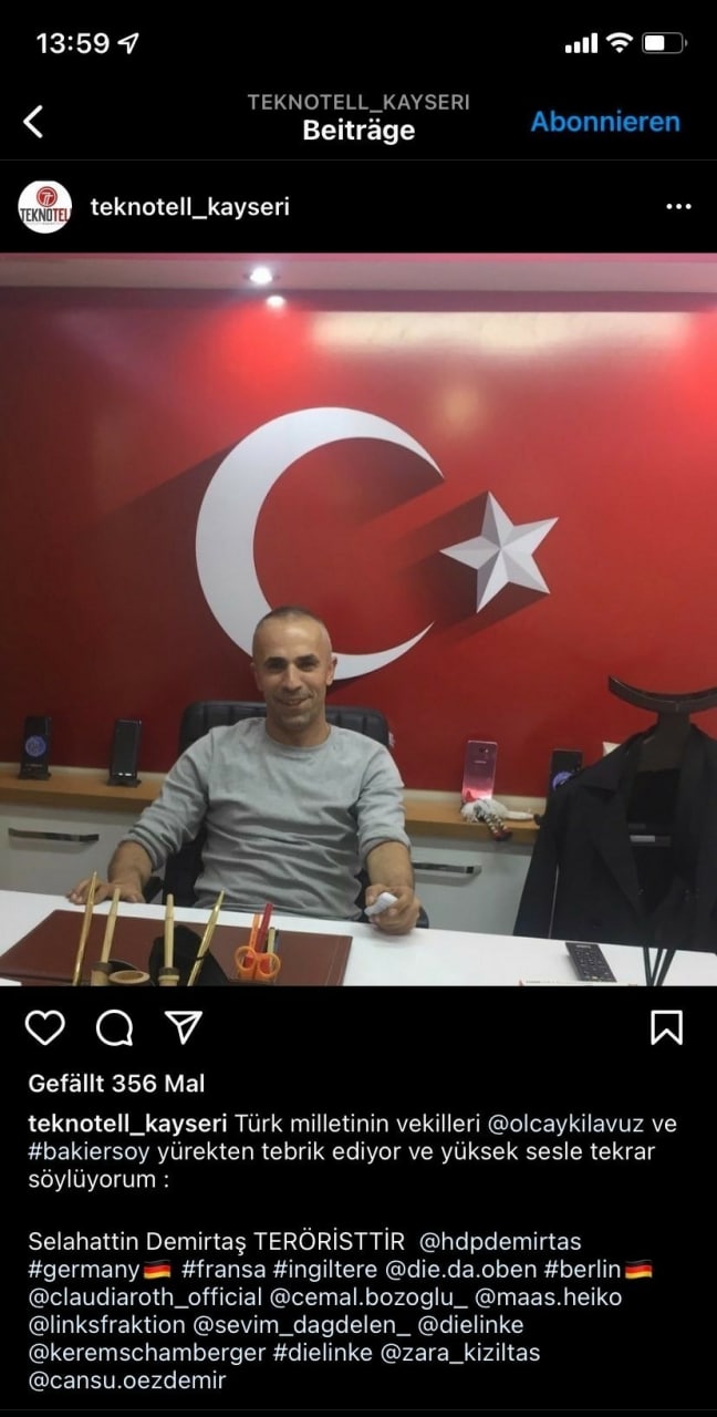 “Aylardır bize ölüm tehditleri gönderen Kayserili Türk faşist Tayfun Karakol, şimdi Almanya’ya geleceğini ve pasaportunu göstereceğini açıkladı. Eğer bu doğruysa, Almanya’da polis harekete geçecek mi?”
