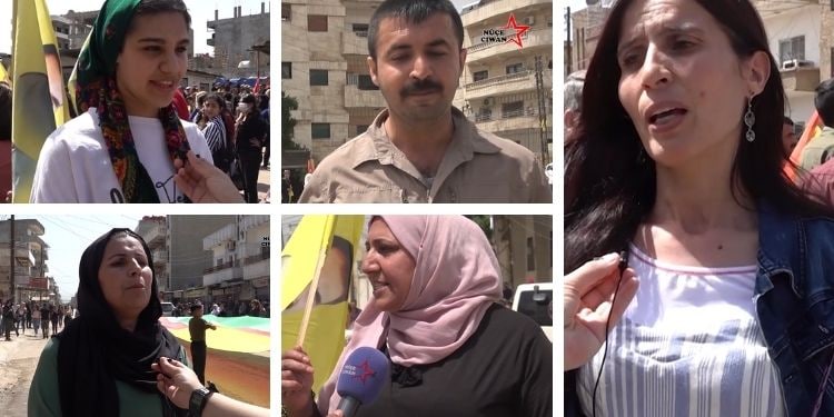 Yüzlerin alanlara çıktığı eylemde, halkın ihanet ve işgal saldırılarına karşı tavrı çok net olurken, bizde Nûçe Ciwan ajansı olarak mikrofonumuzu yürüyüşe katılanlara uzattık.