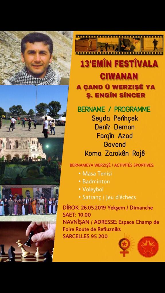 Bu seneki festivalde açılış konuşması, spor turnuvalarımız ve ses sanatçılarımız olacak. Hazırladığımız programda; futbol turnuvasının final maçı olacak ardından masa tenisi, badminton, voleybol ve satranç müsabakaları olacak. Futbol turnuvasına katılımın çok olması nedeniyle turnuvalar önceden oynandı ve final maçı da festival alanında Paris’te birinci olan “Fc Les Moreaux Gençlik” ve Rennes şehrinde birinci olan “Rennes Gençlik” takımları arasında olacak. Festivalde Seyda Perinçek, Deniz Deman, Farqin Azad, Koma Zarokên Rojê ve Govend ekibi sahne alacak.