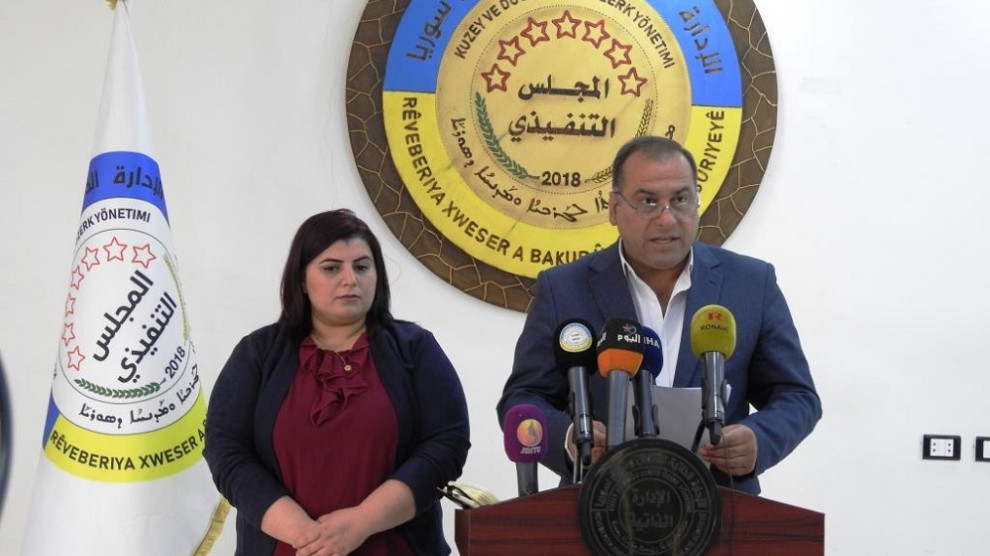 ROJAVA – Tüm dünyayı tehdit eden Covid-19 (Koronavirüs) pandemisine ilişkin Reqa’daki Özerk Yönetim binasında basın toplantısı düzenleyen Kuzey ve Doğu Suriye Özerk Yönetimi Yürütme Meclisi Eşbaşkanları Abid Hamid El-Mihbaş, Bêrîvan Xalid, Kuzey ve Doğu Suriye halkının sağlığını korumanın öncelikli görevleri olduğuna dikkat çekti. Açıklamanın Arapçası Abid Hamid El-Mihbaş, Kürtçesi ise Bêrîvan Xalid tarafından okundu.
