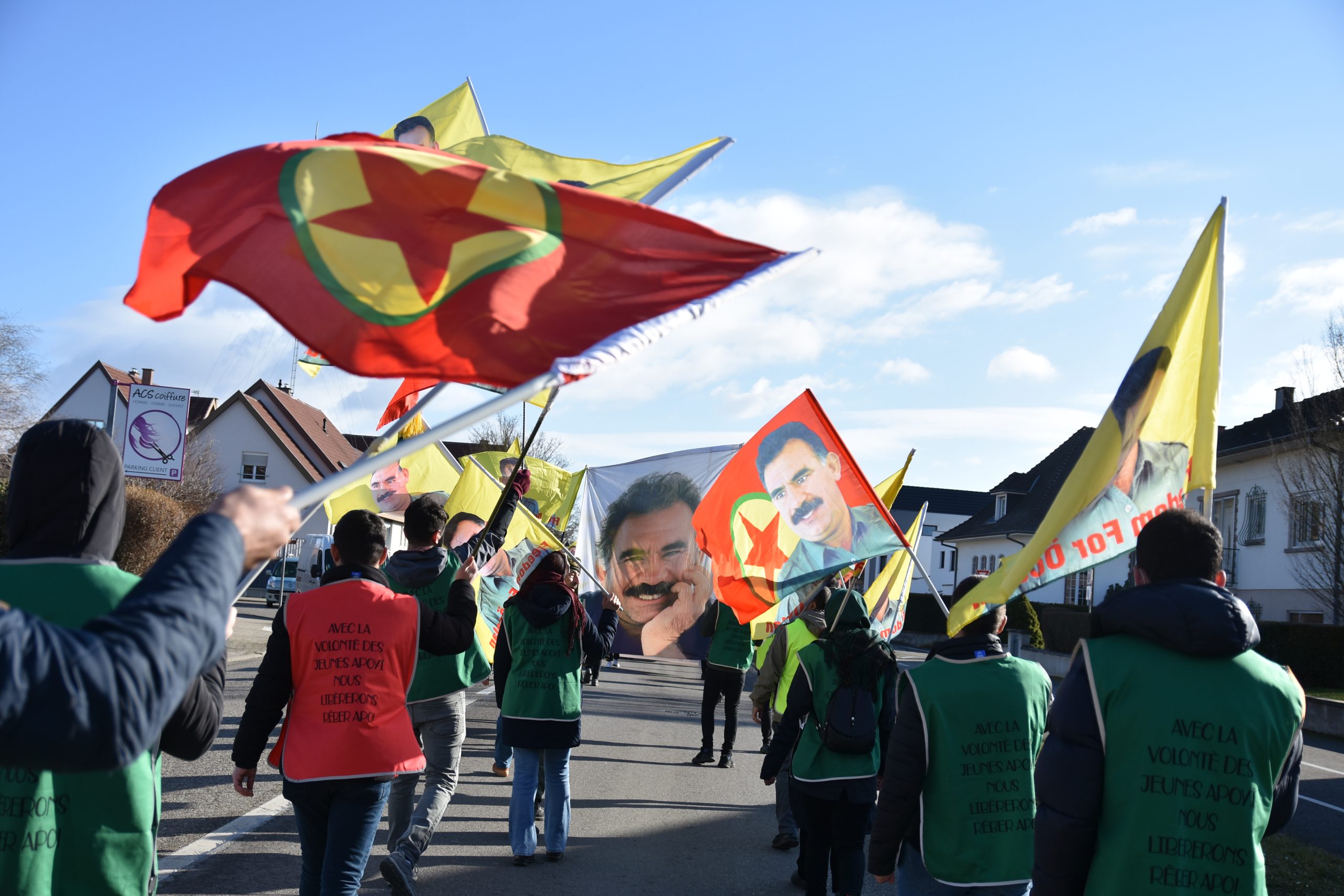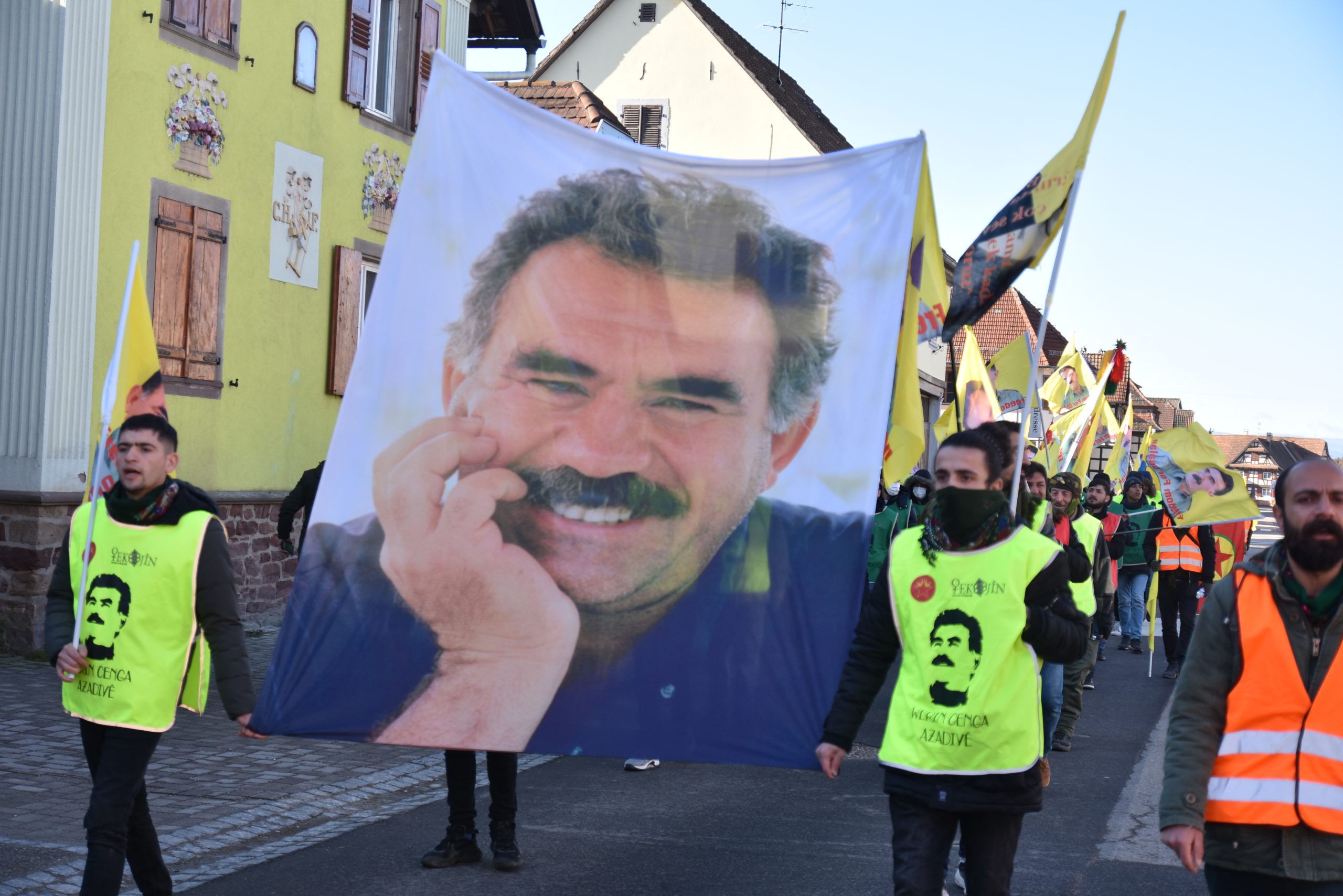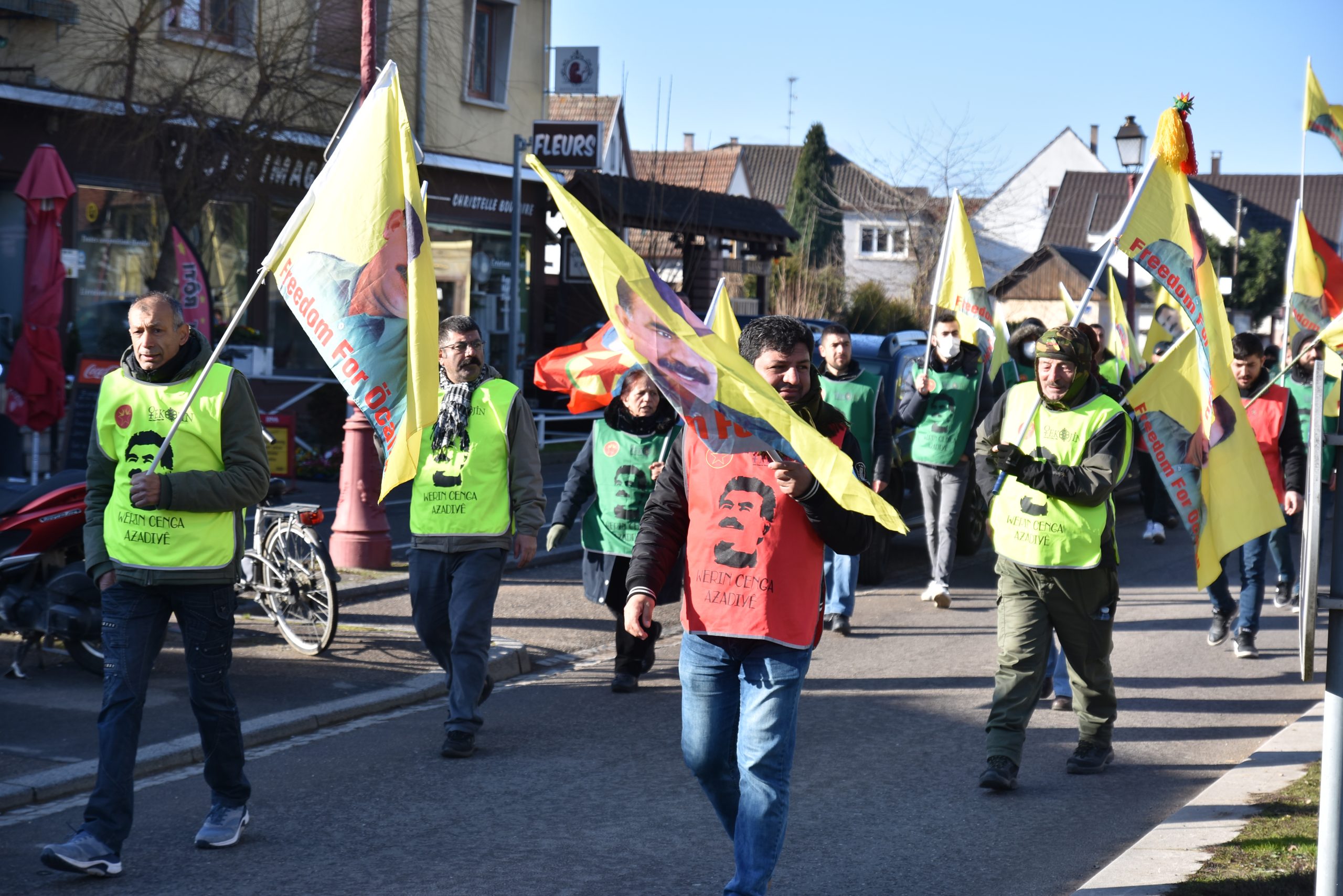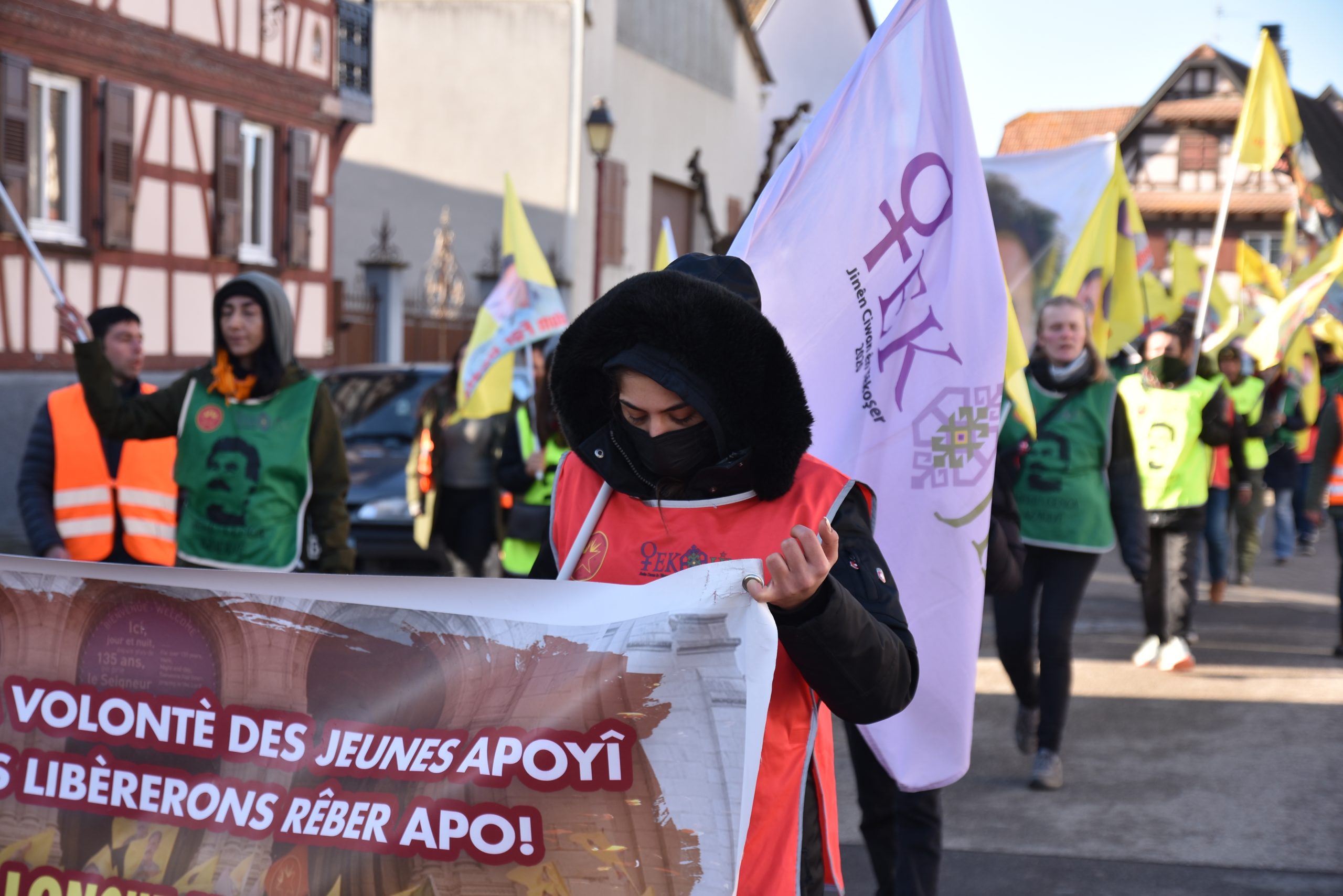 Erstein kentinin merkezinde bir çok gencin katılımı ile başlayan yürüyüş sokak aralarında coşkulu bir şekilde „Bijî Serok APO“ ve „Be Serok Jiyan Nabe“ sloganları ile sürdürülüyor.