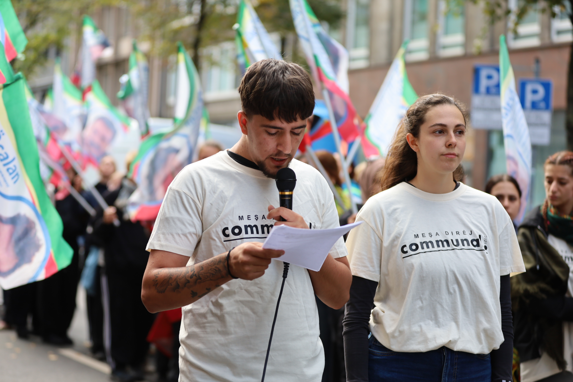 Toplanma, Kürdistan ve devrim şehitleri anısına yapılan saygı duruşuyla başladı. Ardından enternasyonalist devrimciler Kleo ve Dennis, yürüyüşçüler adına bir basın açıklaması yaptı. Açıklamada yeni mücadele döneminde enternasyonal mücadelenin önemi vurgulandı.