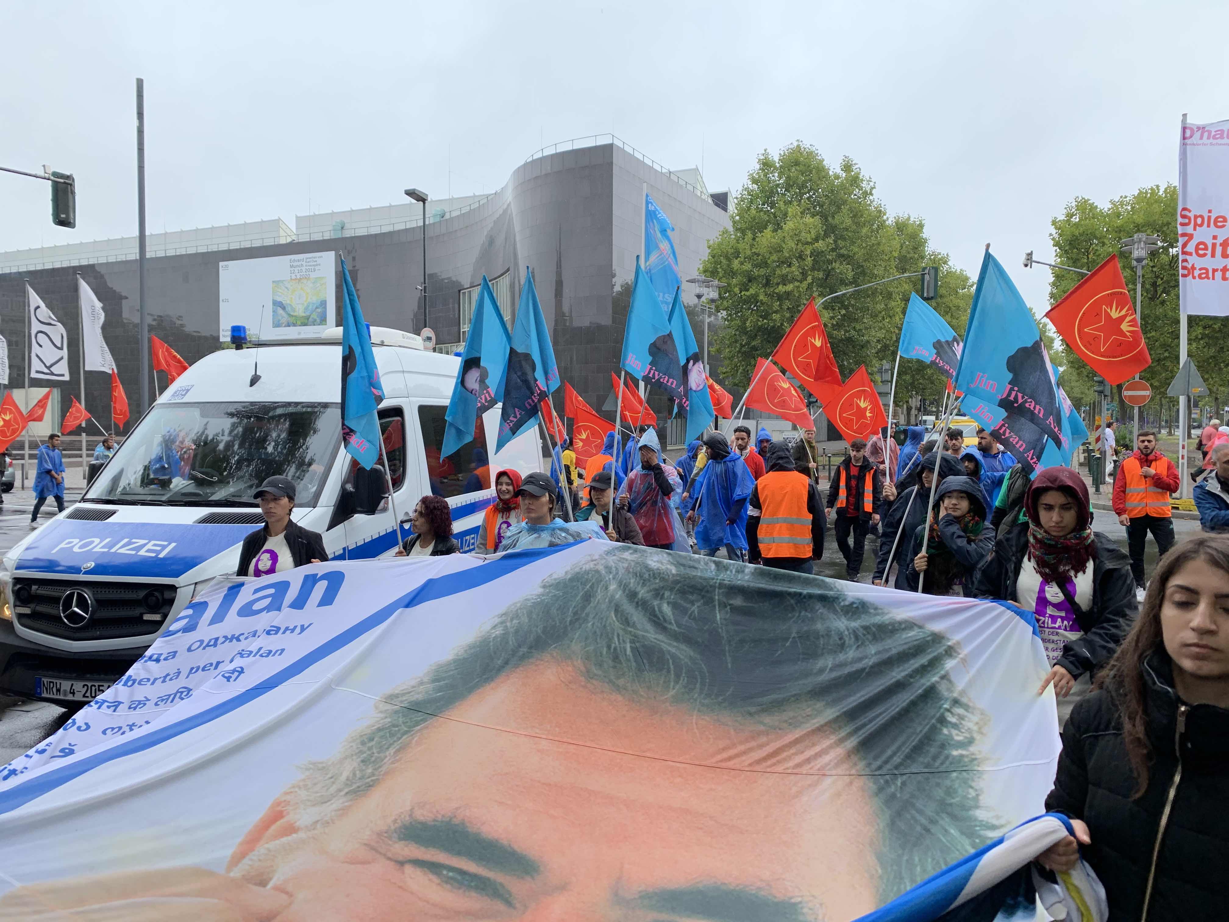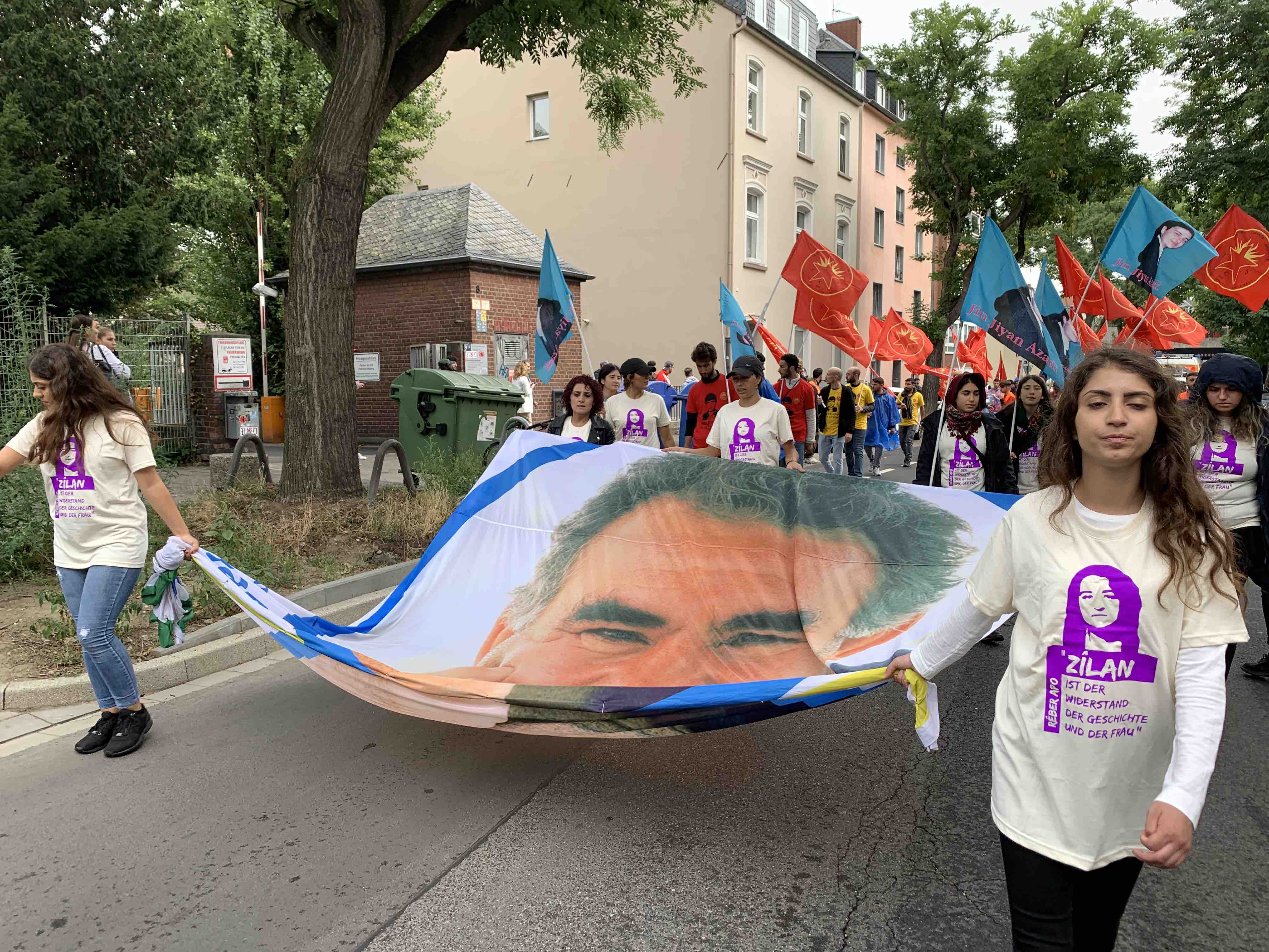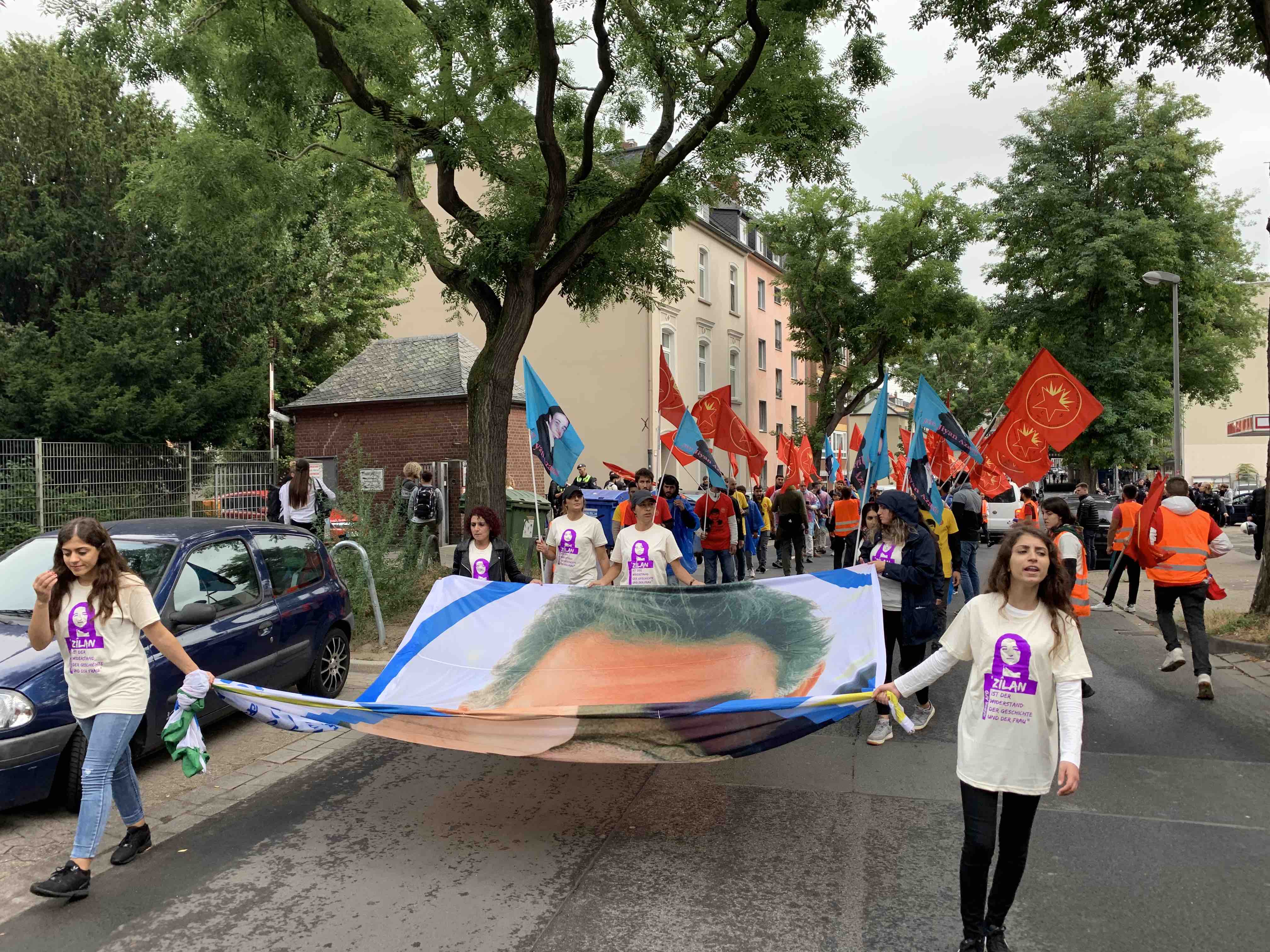 Sabah 10’da Düsseldorf’ta gençlerin toplanmasıyla yağmurlu bir havada başlayan yürüyüş, bugün genç kadınlar öncülüğünde yapılıyor. Dersim’de 1996 yılında fedai eylem gerçekleştiren Zeynep Kınacı’nın resminin olduğu ve ‘Zîlan, tarihin ve kadının direnişidir. Rêber APO’ yazan t-shirtlerle ve Tevgera Ciwanên Şoreşger ve Şehit Zîlan bayraklarının açıldığı yürüyüşte sık sık ‘Jin, Jiyan, Azadî’ , ‘Bê Serok Jiyan Nabe’ , ‘Ciwan fedaiyê Serok APO’ye’ sloganları atılıyor.