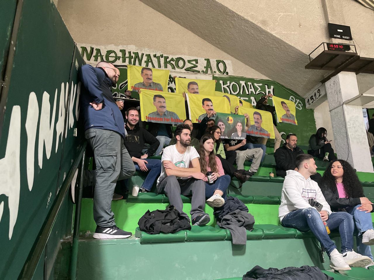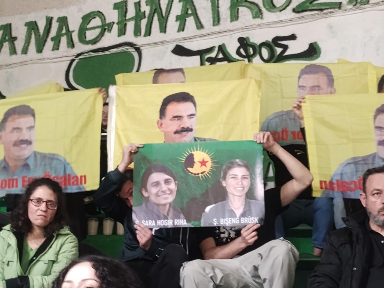 ATİNA- Tevgera Ciwanên Şoreşger (TCŞ) öncülüğünde bir araya gelen Kürt ve enternasyonalist gençler, Yunanistan’ın başkenti Atina’da oynanan Panatinakos Kadın Basketbol maçında Önder Apo’nun posterlerini açarak, Önder Apo için özgürlük taleplerini haykırdı.