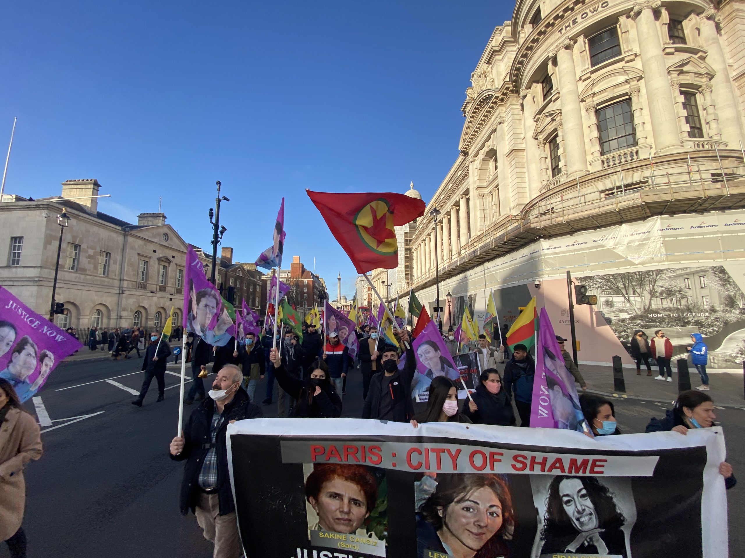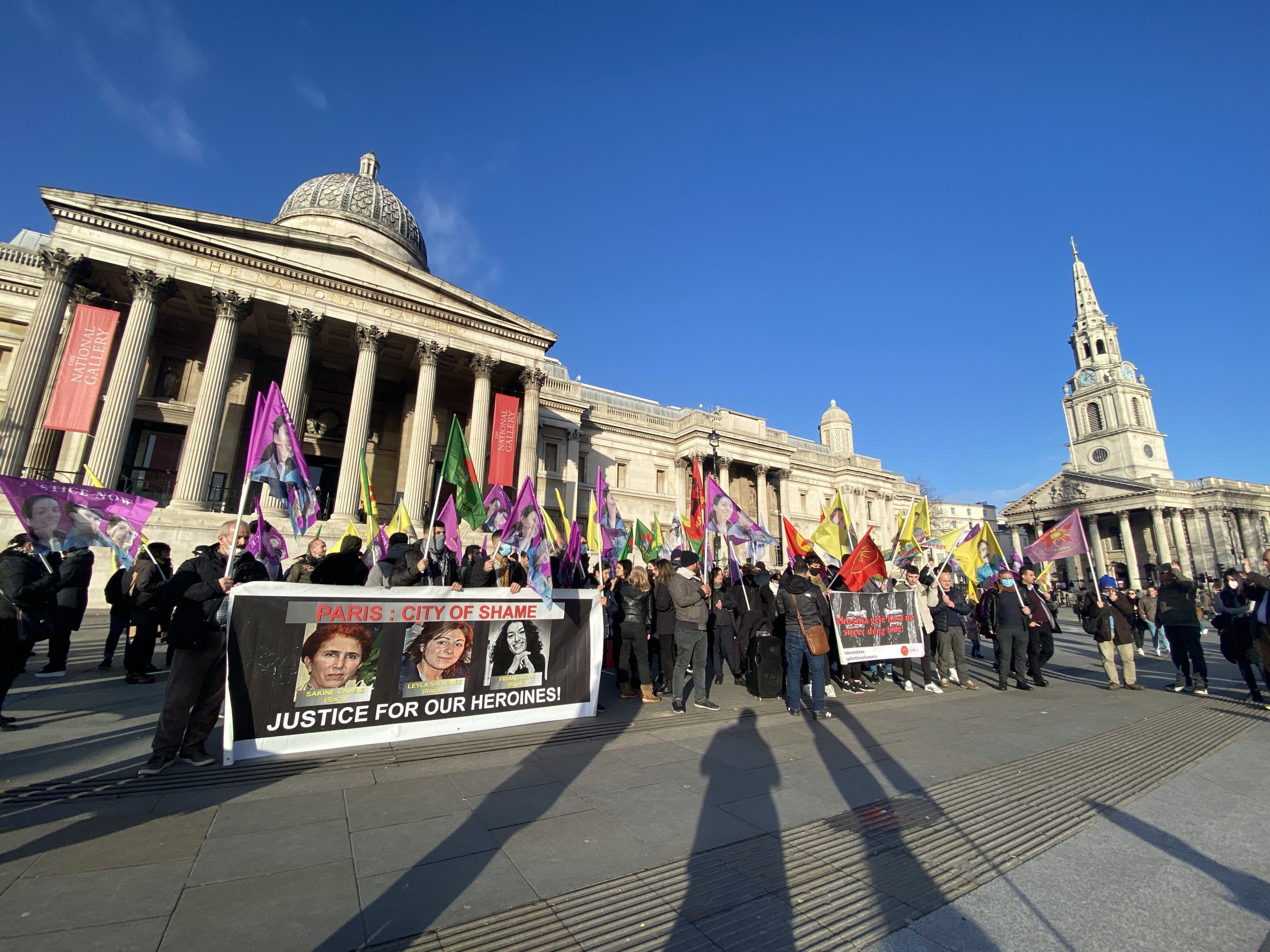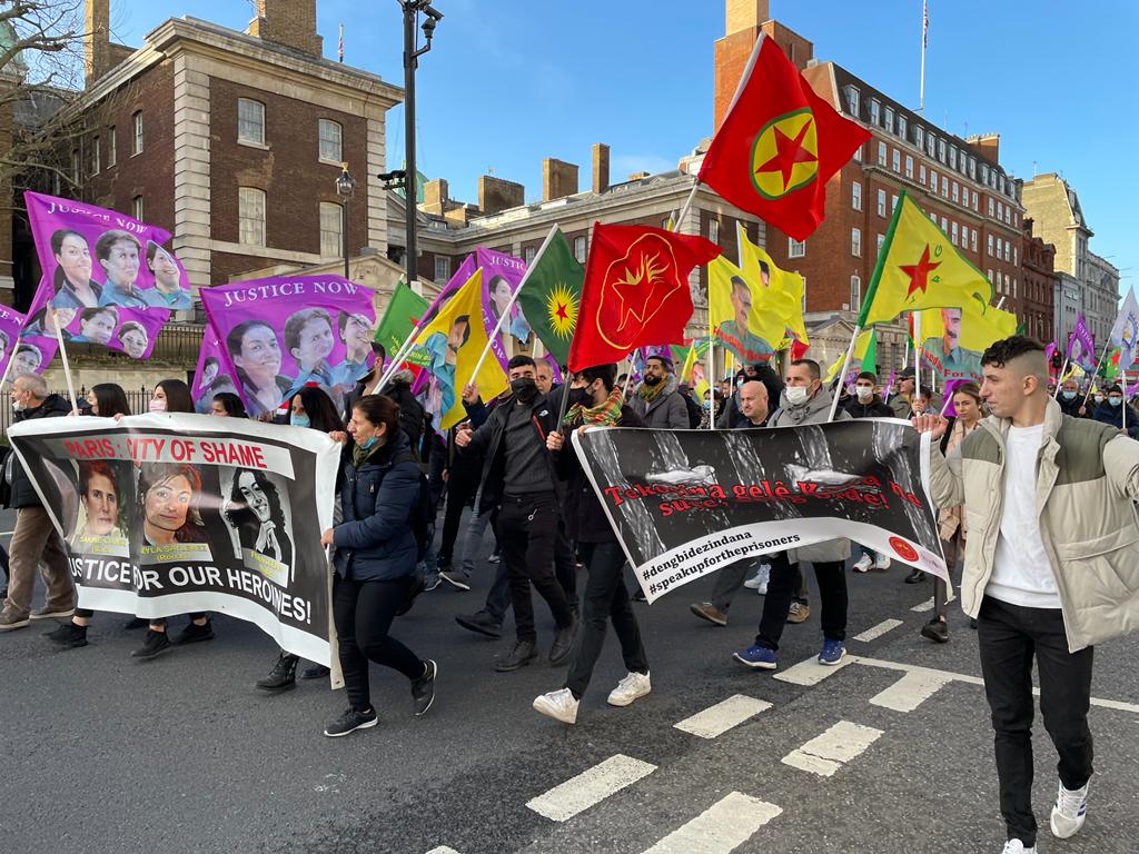 TCŞ, TekoJIN ve Britanya Kürt Kadın İnisiyatifi tarafından organize edilen yürüyüş Trafalgar Meydanı’nda start aldı. Yürüyüşe, çok sayıda Kürdistanlı ve dostları katıldı. Yürüyüşün en önünde Sakine Cansız, Leyla Şaylemez ve Fidan Doğan’ın fotoğraflarının olduğu pankartlar ve yürüyüş boyunca da üzerinde üç kadın devrimcinin fotoğraflarının olduğu, PKK ve Önder Öcalan’ın bayrakları dalgalandırıldı.
