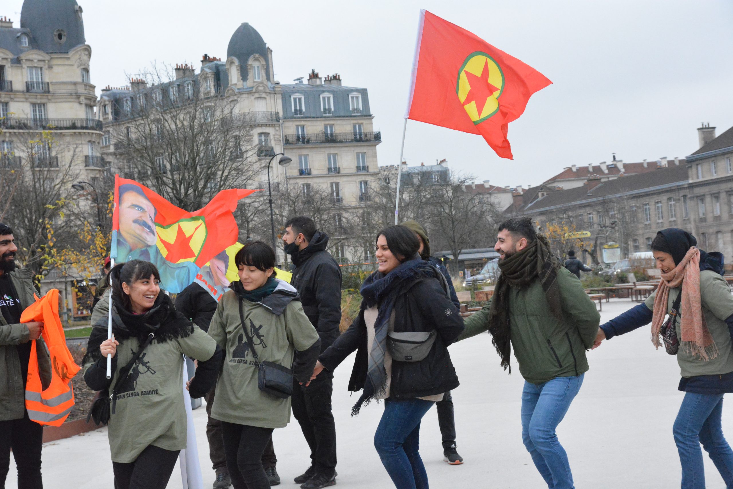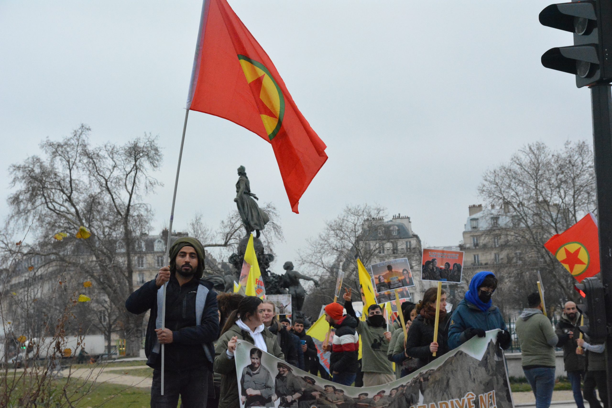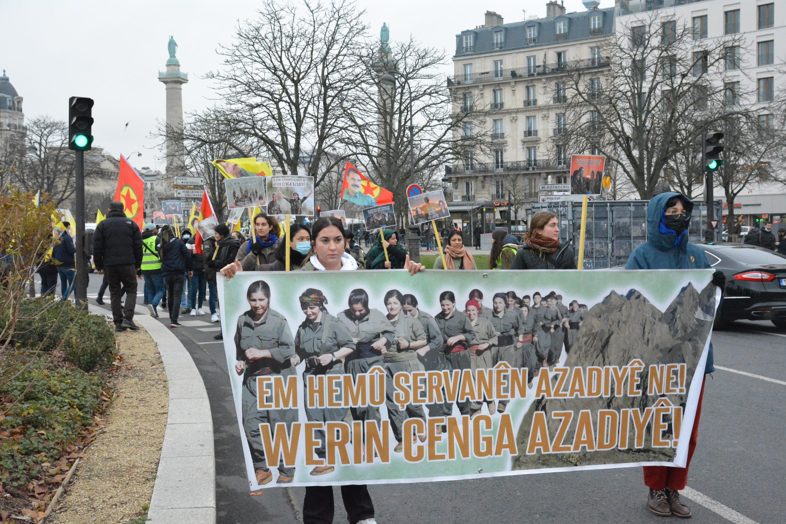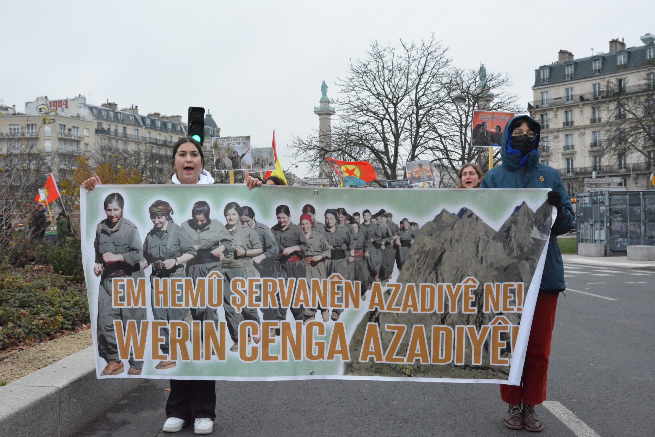Gençler “Em Hemû Şervanên Azadiyê ne, Werin Cenga Azadiyê” yazılı pankartlar yürüyüşlerine başladı. Pankartın yanı sıra şehitlerin ve Önder Öcalan’ın döviz ve posterleri de taşındı Gençler, National sokaklarında Fransızca, Kürtçe ve Türkçe sık sık “Ciwan fedaiye Rêber Apo ye” ve “Bijî Berxwedana Gerîla” sloganları atıyor.