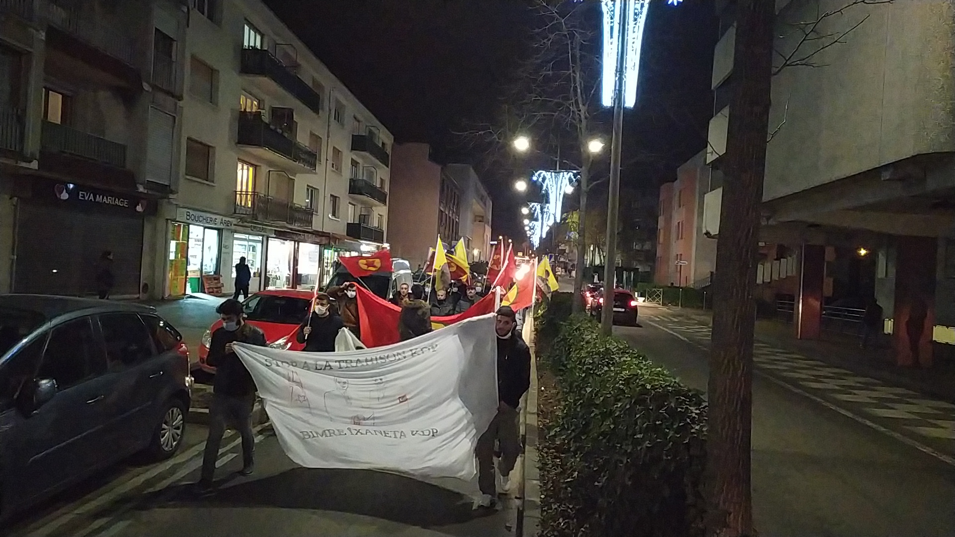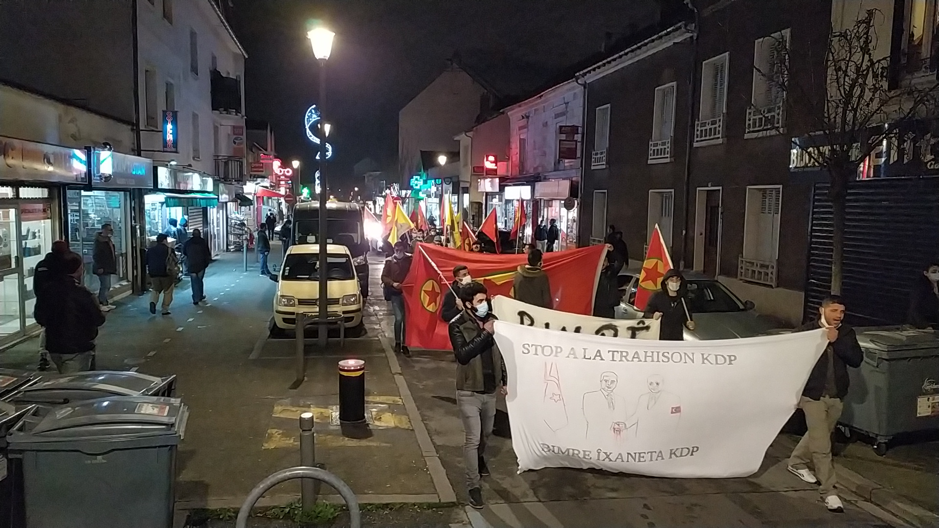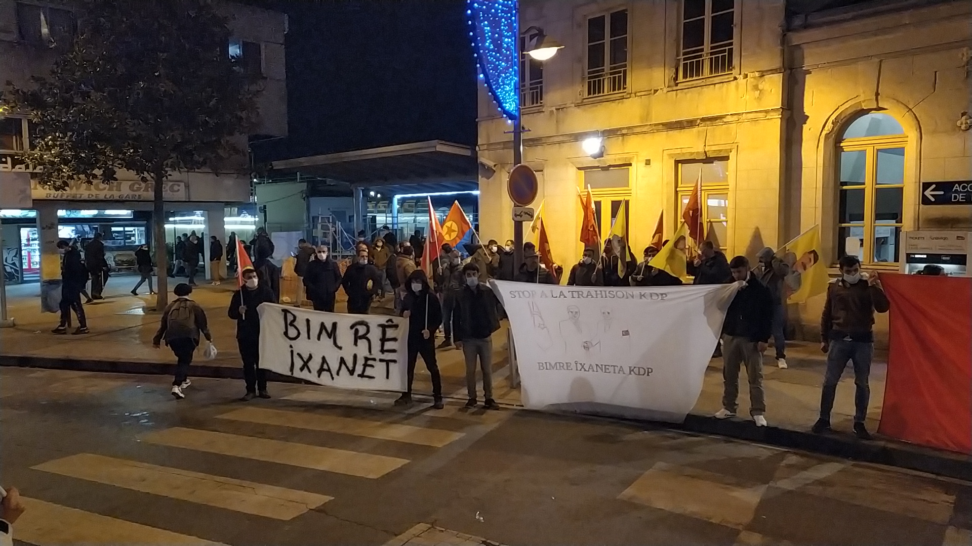 Saat 19’da tren istasyonu önünde gençlerin toplanması ile başlayan eylemin en önünde, “Stop a la trahison KDP – Bimrê Îxaneta KDP” (KDP’nin İhanetini Durdurun) yazılı pankart ve büyük bir PKK bayrağı açıldı. Eylemde gençler sık sık, “Assassin Barzanî (Katil Barzanî)”, “A Bas Le Régime Fasciste En Turquie (Kahrolsun Faşist Türk Rejimi)”, “Bijî Serok APO” ve “Bi Hev Re Serhildan” sloganlarını attı. Çevredeki insanlar alkış ve kornalarla eyleme destek verirken, gençler yaptıkları açıklamada KDP ve Barzanî ailesinin işgalci güçlerle işbirliğine bir an önce son vererek, ihanetten vazgeçmelerini belirttiler.