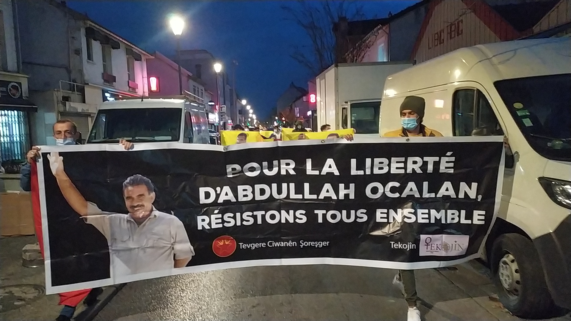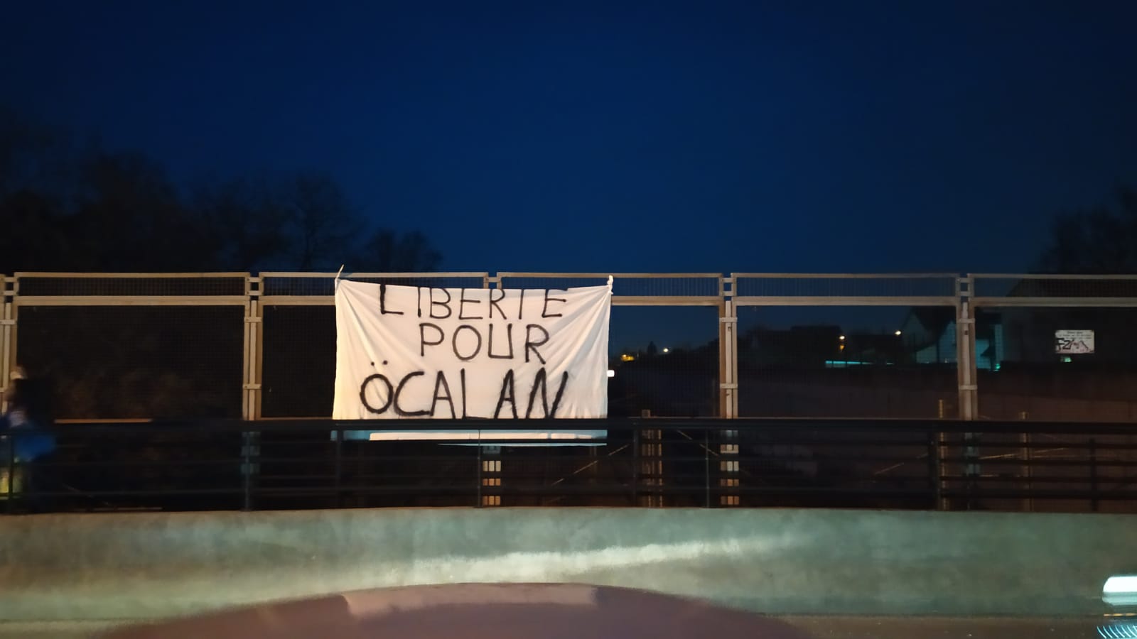 TCŞ aktivistleri, akşam saatlerinde bir de pankart asma eylemi gerçekleştirdi. Gençler, yürüyüşten sonra yol kenarına üzerinde Fransızca, “Liberté pour Öcalan” (Öcalan’a Özgürlük) yazılı pankartı astı.