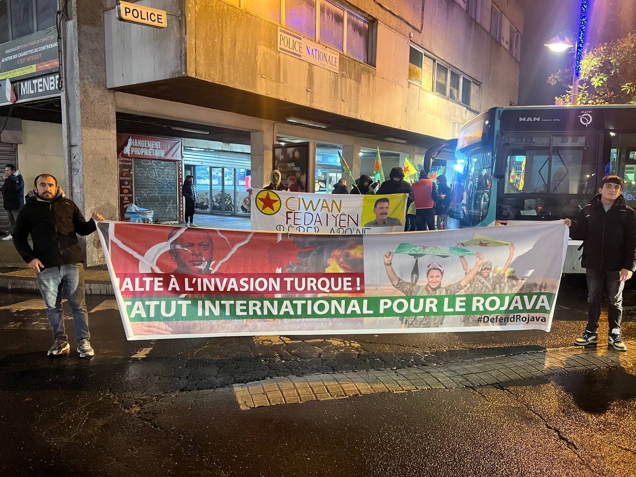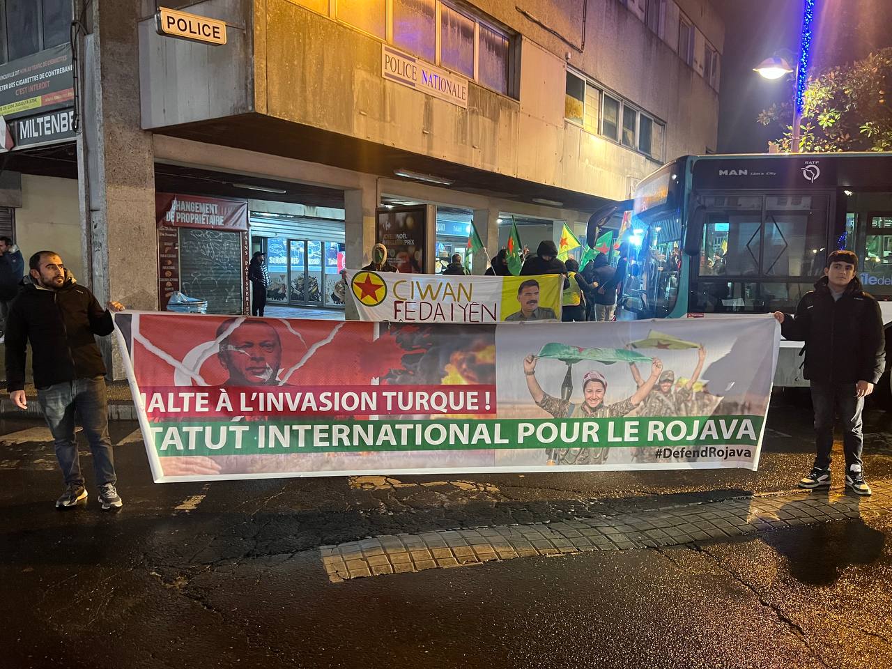 Faşist işgalci Türk devletinin Rojava’ya dönük saldırılara karşı yüzlerce kişinin katıldığı eylemde sık sık, “Bijî Berxwedana Rojava”, “Bijî Berxwedana YPG”, “Bijî Serok APO”, ve “Jin jiyan azadî” sloganları atıldı.