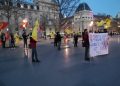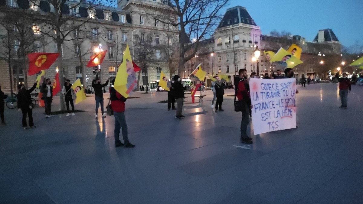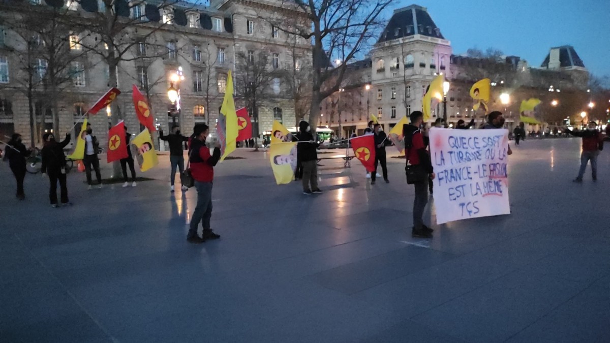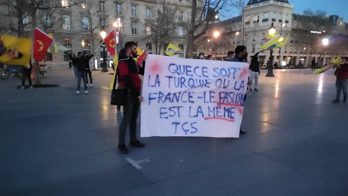 Republique Meydanında bir araya gelen gençler işlek caddelerden birini trafiğe kapattı. Eylemde üzerinde Fransızca “Türk devletiyle Fransa hükümetinin faşizmi aynıdır” yazılı bir pankart, PKK ve Önder Öcalan’ın bayrakları taşındı.