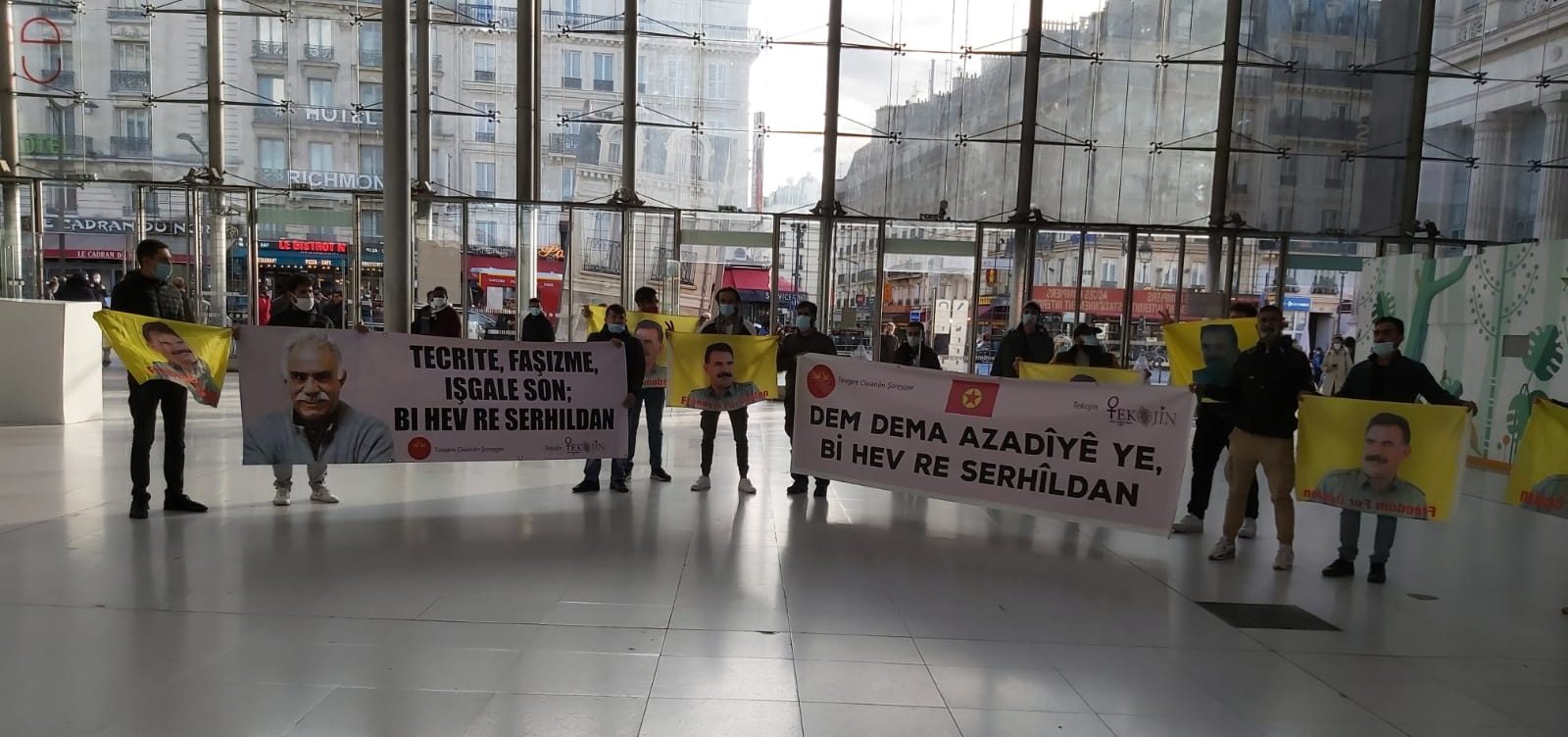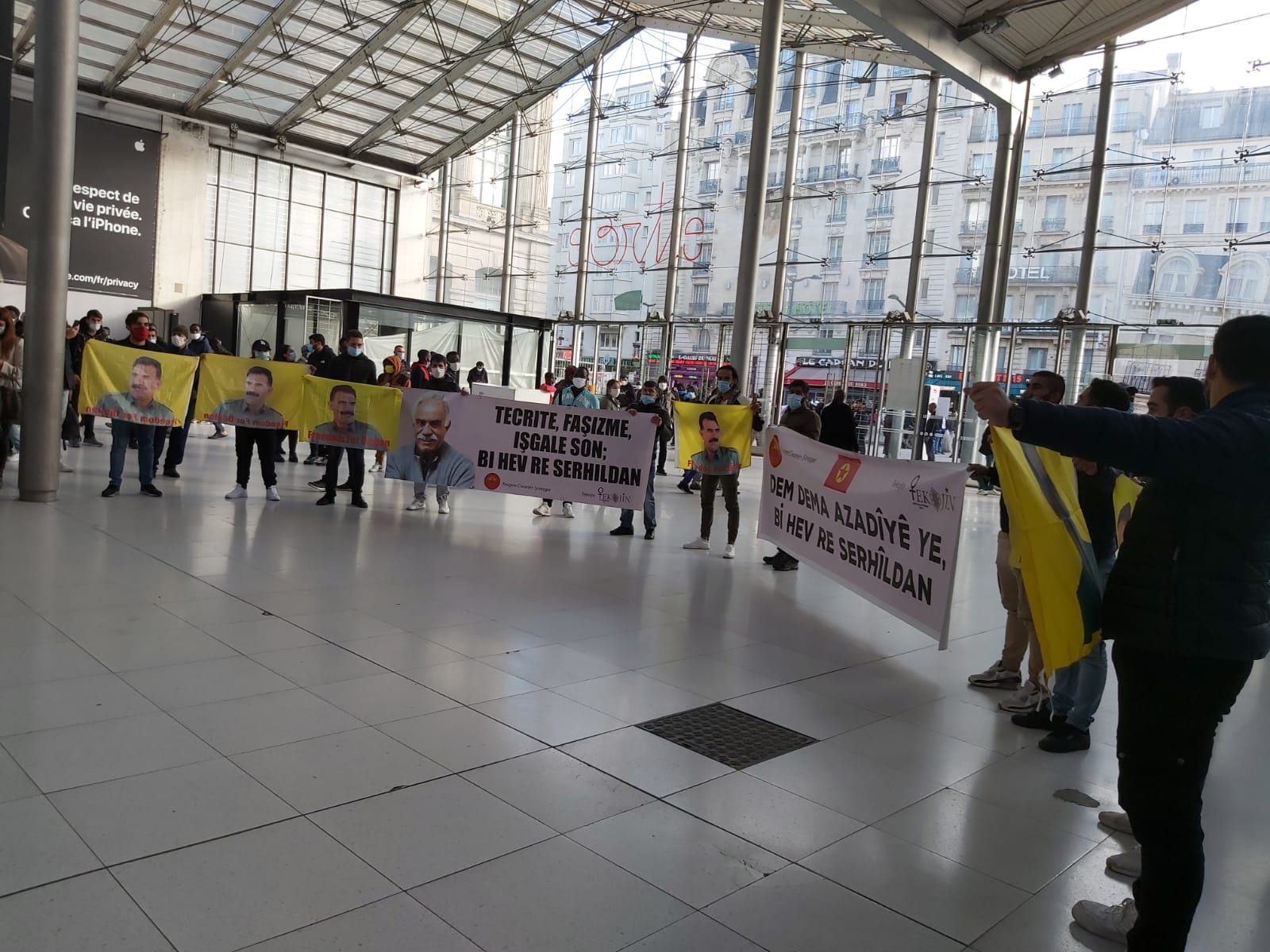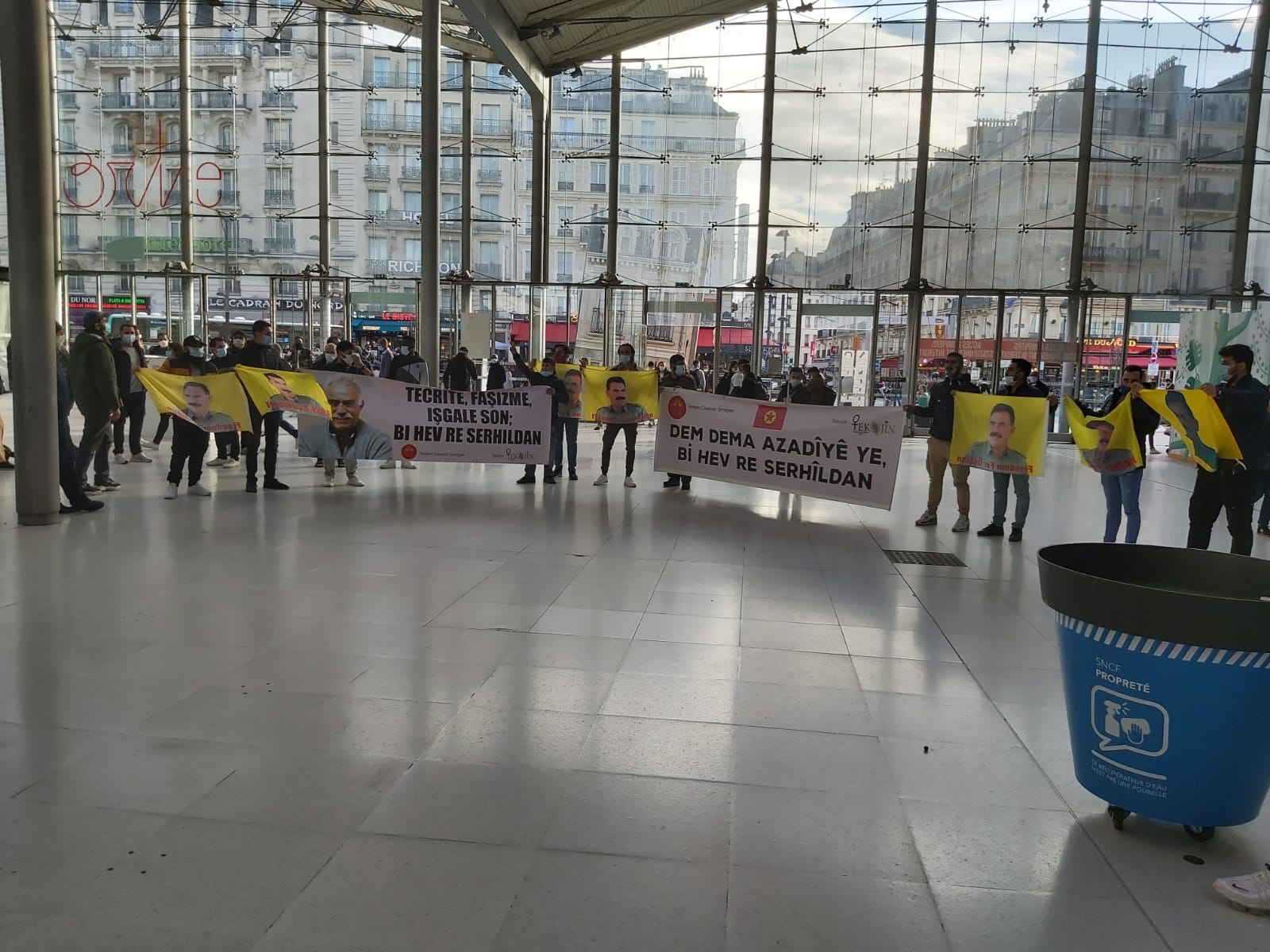 “Tecride, Faşizme, İşgale Son: Bi Hev Re Serhildan” şiarıyla garın içinde düzenlenen eylem saat 16.30’da başladı. “Dem Dema Azadîye, Bi Hev Re Serhildan” pankartının açıldığı eylemde gençler Halklar Önderi Abdullah Öcalan’ın posterlerini açtı. Önder Öcalan’a yönelik faşist Türk devletinin verdiği avukat görüş ve iletişim yasaklarını protesto eden gençler, attıkları Fransızca ve Kürtçe sloganlar ile Türk faşizmini protesto etti.