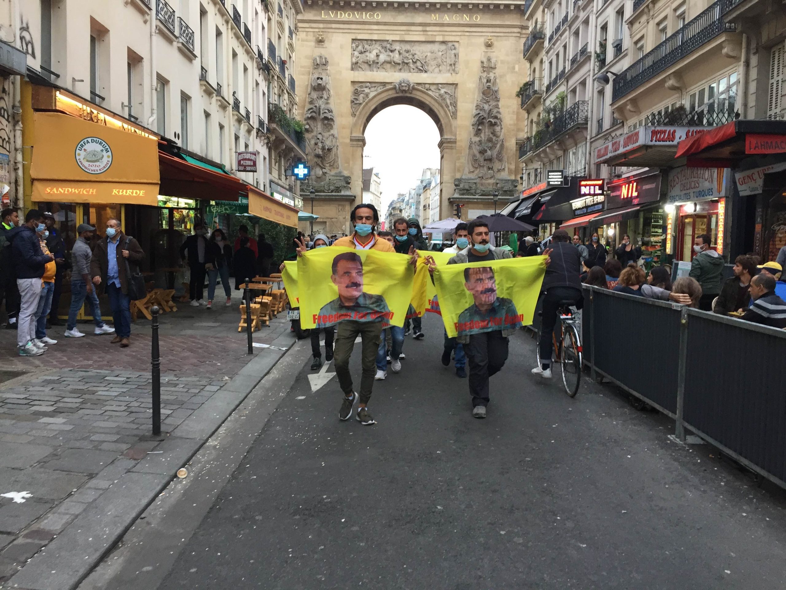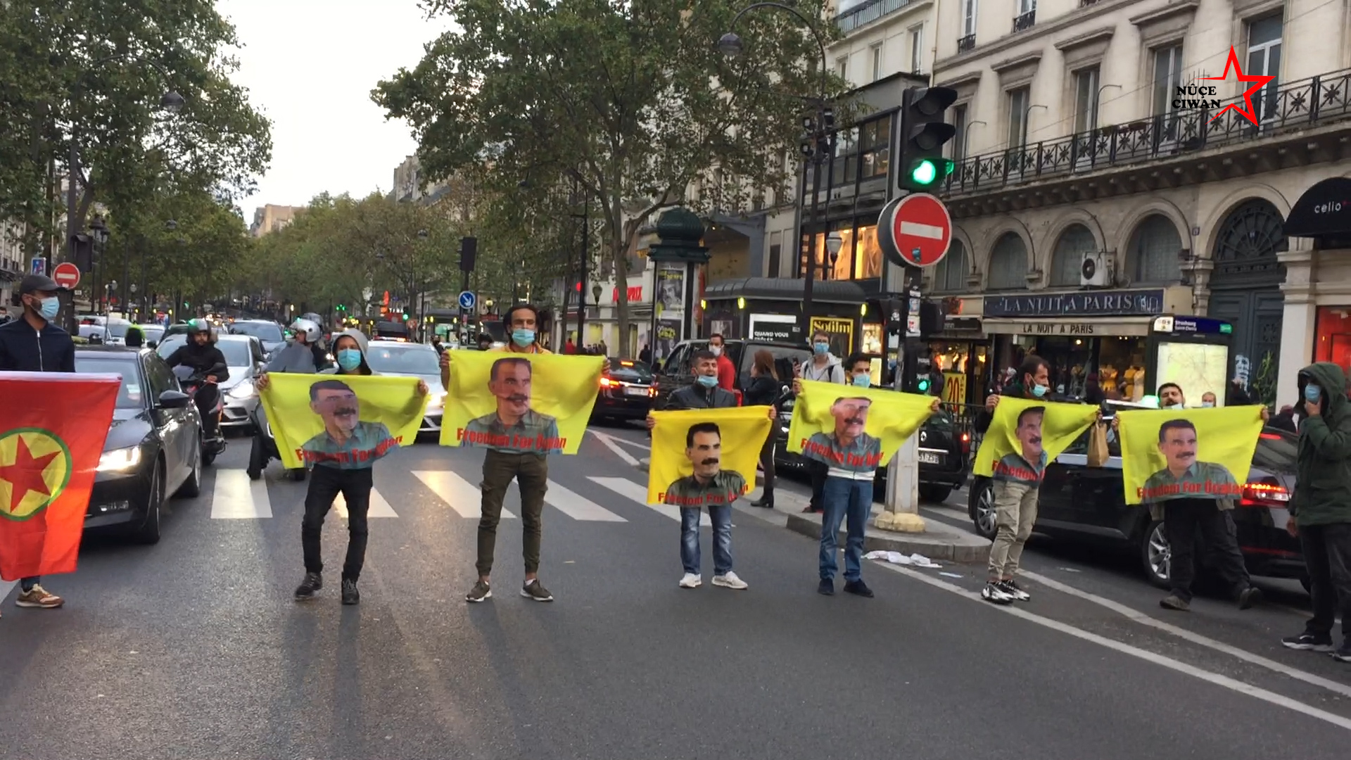 Saat 19’da Paris’in Strasbourg – Saint-Denis semtinde bir araya gelen gençler, ilk olarak Parislilerin yoğun olduğu çarşı merkezinde bir yürüyüş gerçekleştirdi. Halklar Önderi Abdullah Öcalan’ın posterleri ve PKK bayraklarıyla gerçekleştirdikleri yürüyüşte, “Liberté pour Öcalan”, “Assassin Erdogan”, “Bijî Serok APO” sloganlarını attı.