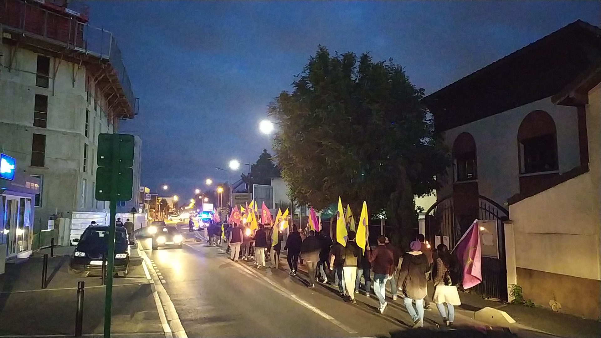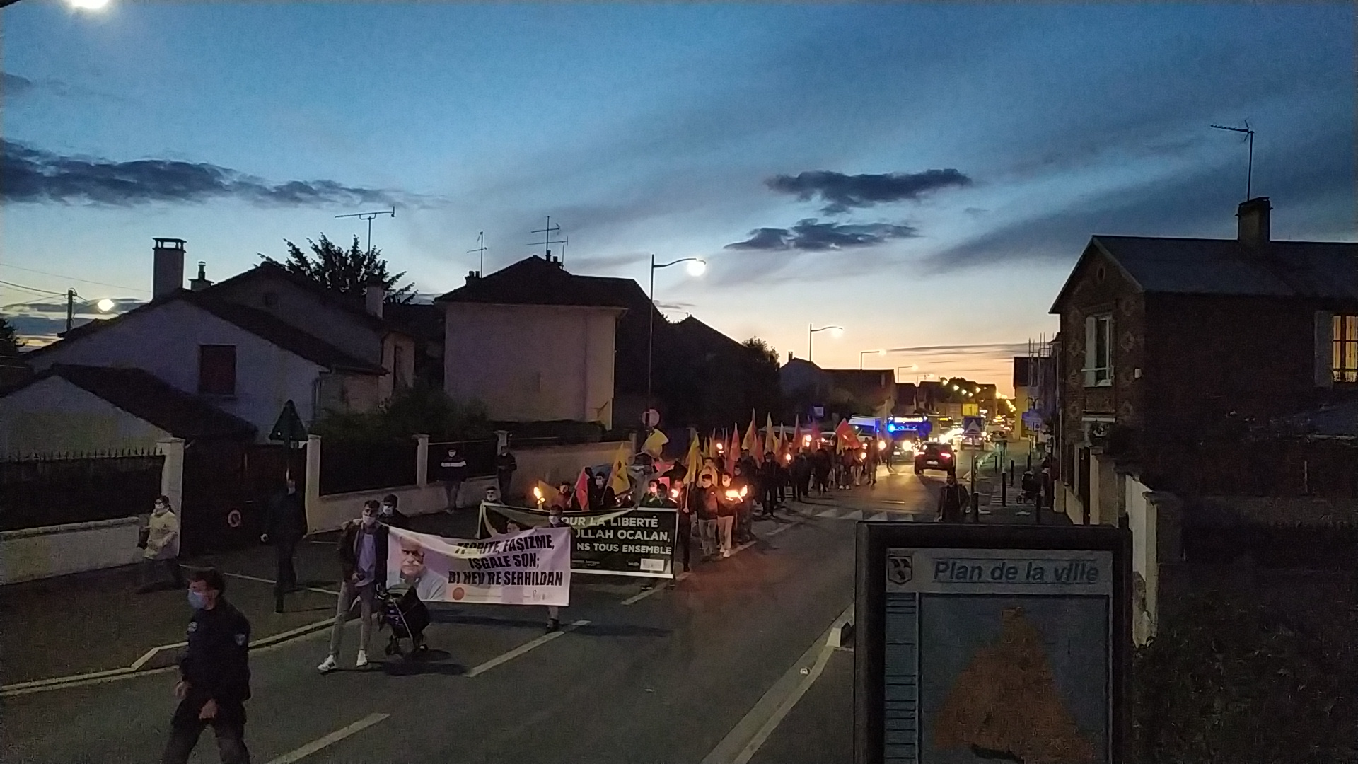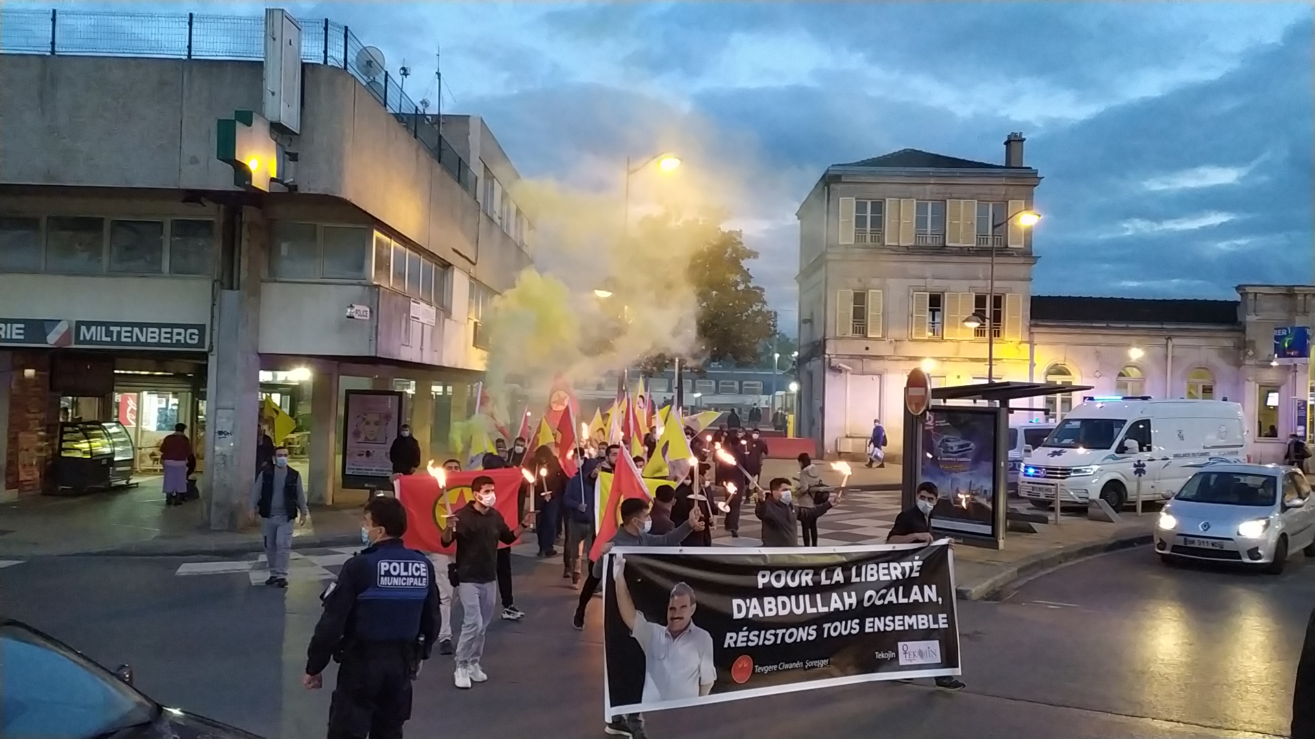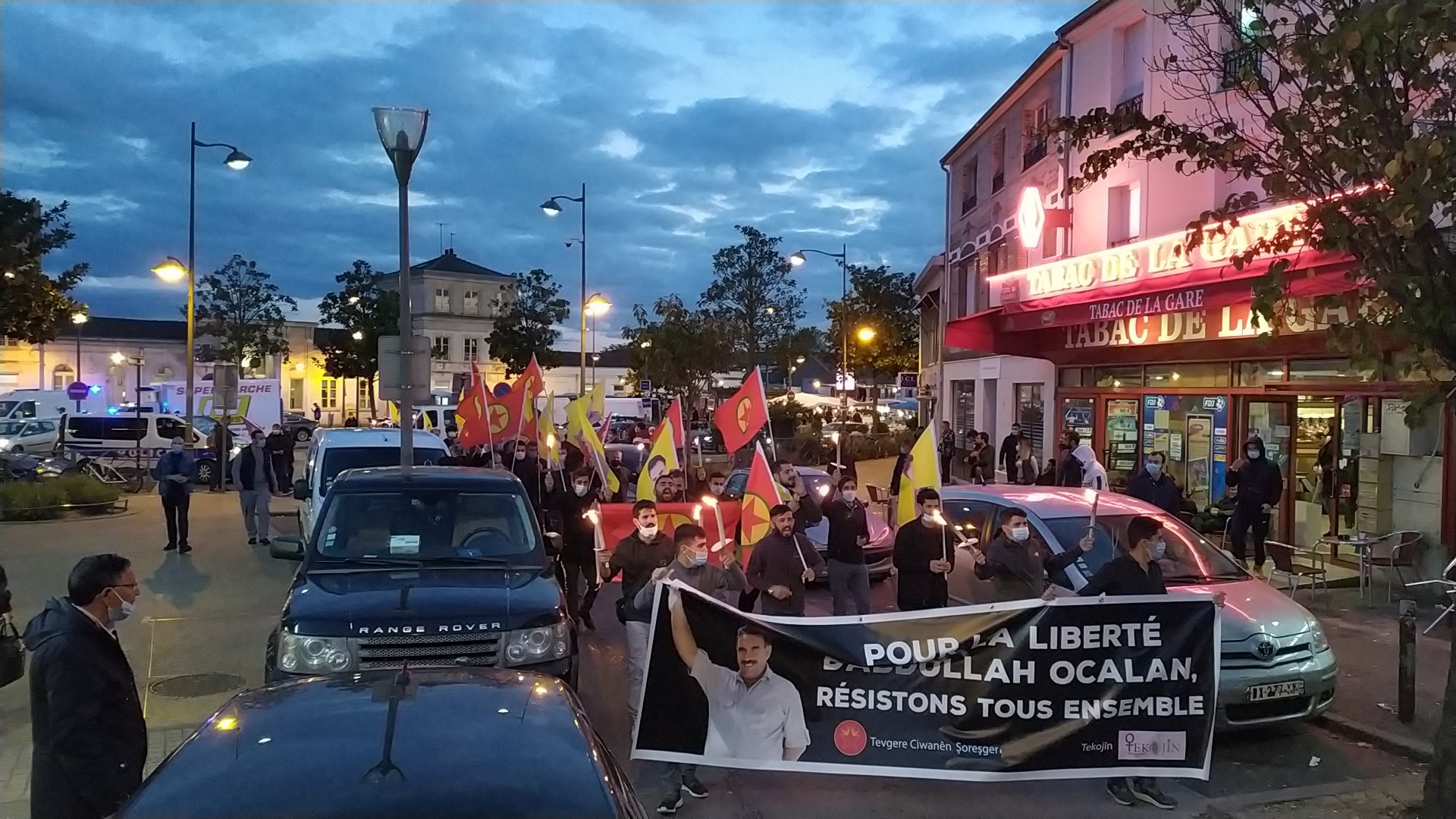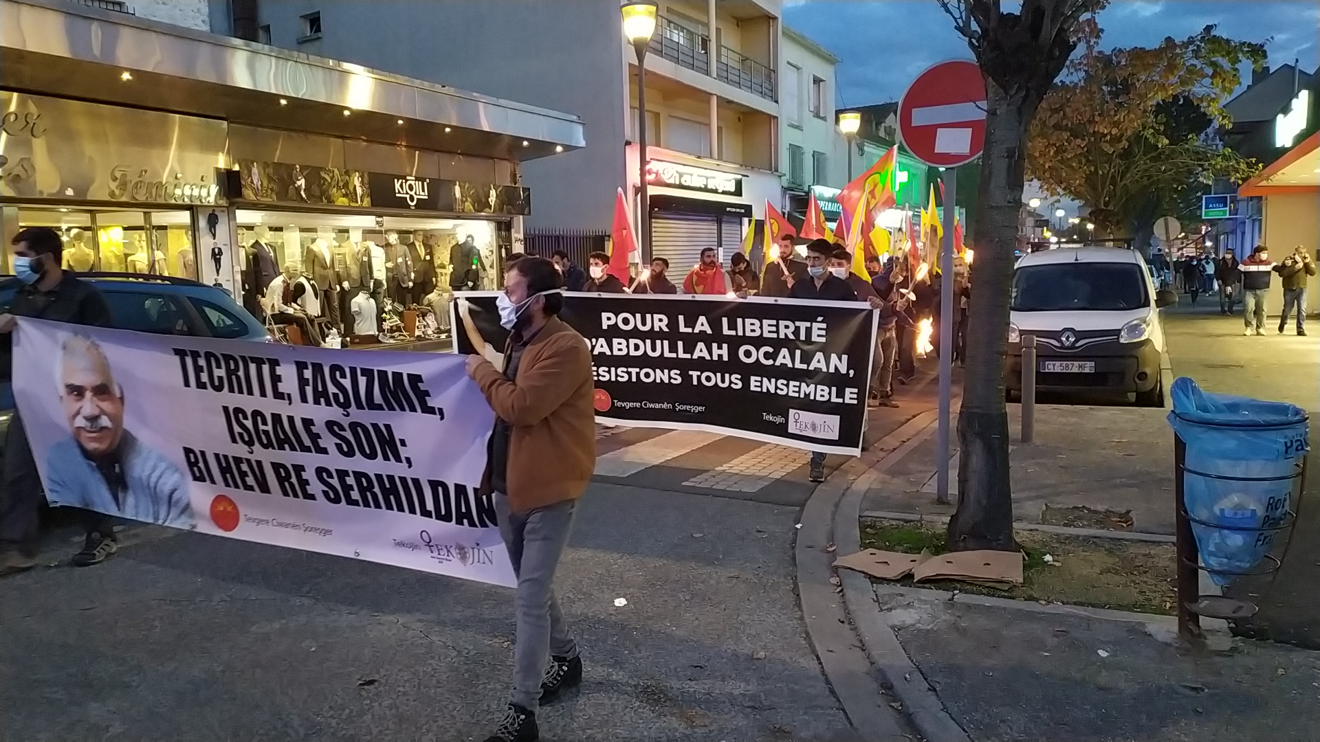 9 Ekim devletlerarası komplosuna karşı yapılan eylem, Villiers Le Bel tren istasyonu önünde saat 20’de başladı. Türkçe “Tecride, Faşizme, İşgale Son: Bi Hev Re Serhildan” ve Fransızca, “Abdullah Öcalan’ın Özgürlüğü İçin Bi Hev Re Serhildan” yazılı pankartların açıldığı yürüyüşte çok sayıda genç yer aldı.