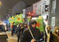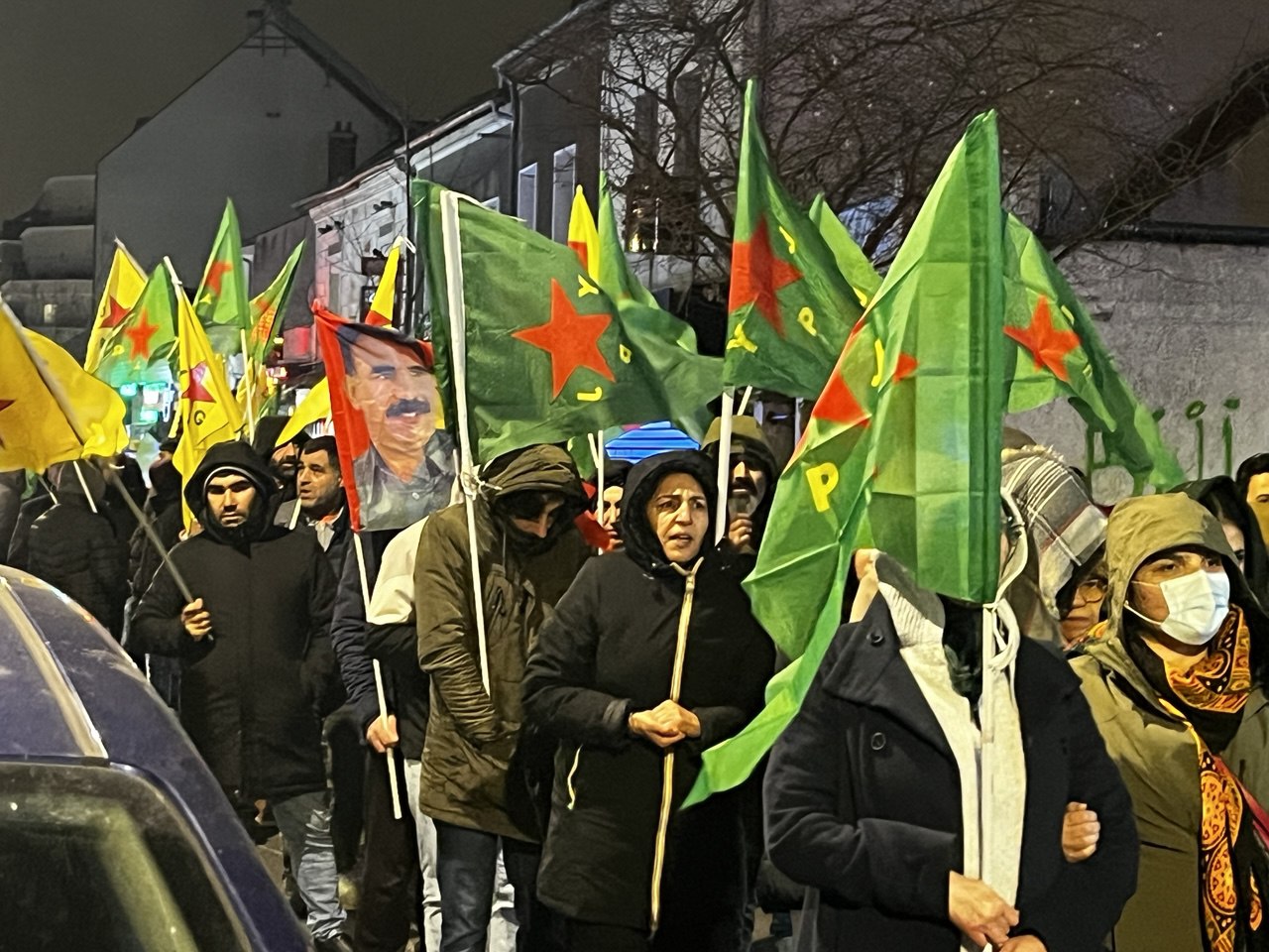 Önder APO’nun resmi, PKK, YPG, YPJ bayrakları ve “Ciwan Fedaiyên Rêber APO ne” (Gençlik Önder APO’nun fedaisidir), “Defend Rojava” (Rojava’yı savun) yazılı pankartlar ile yapılan yürüyüş, Şehîd Evîn Goyî Demokratik Kürt Derneği önünde son buldu.