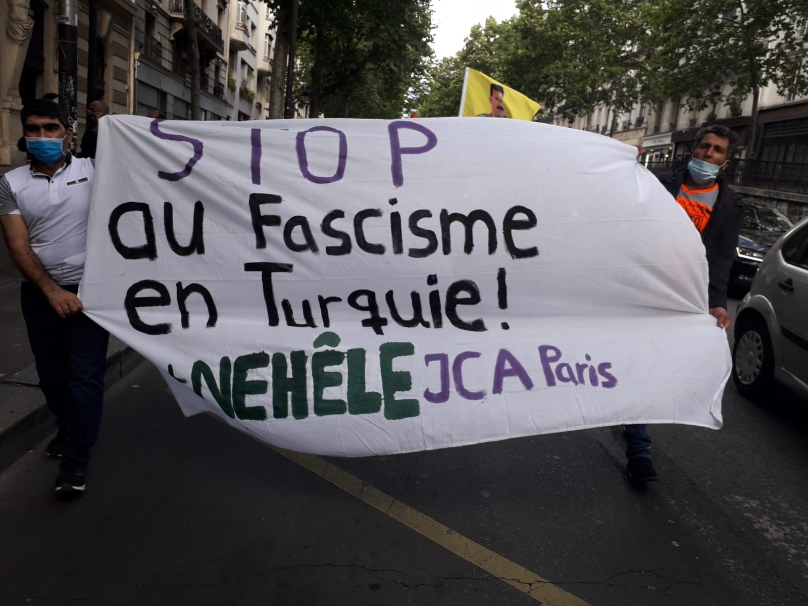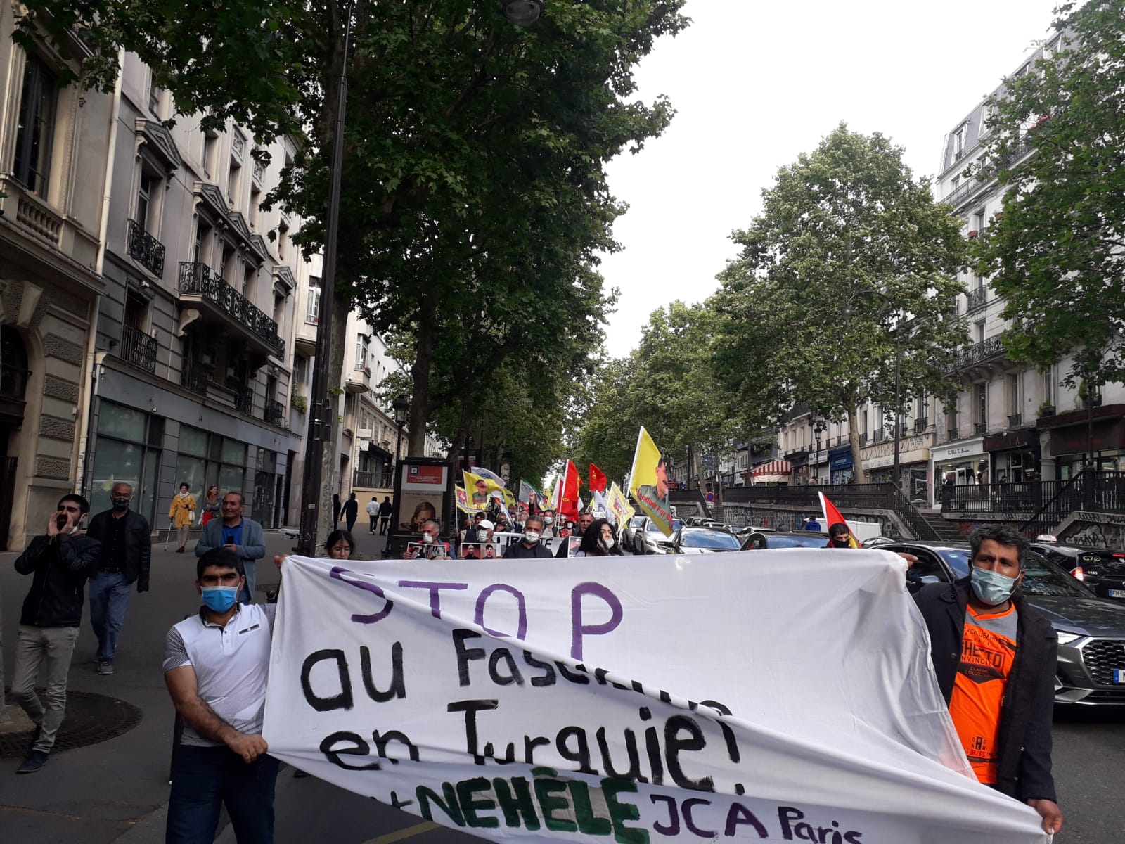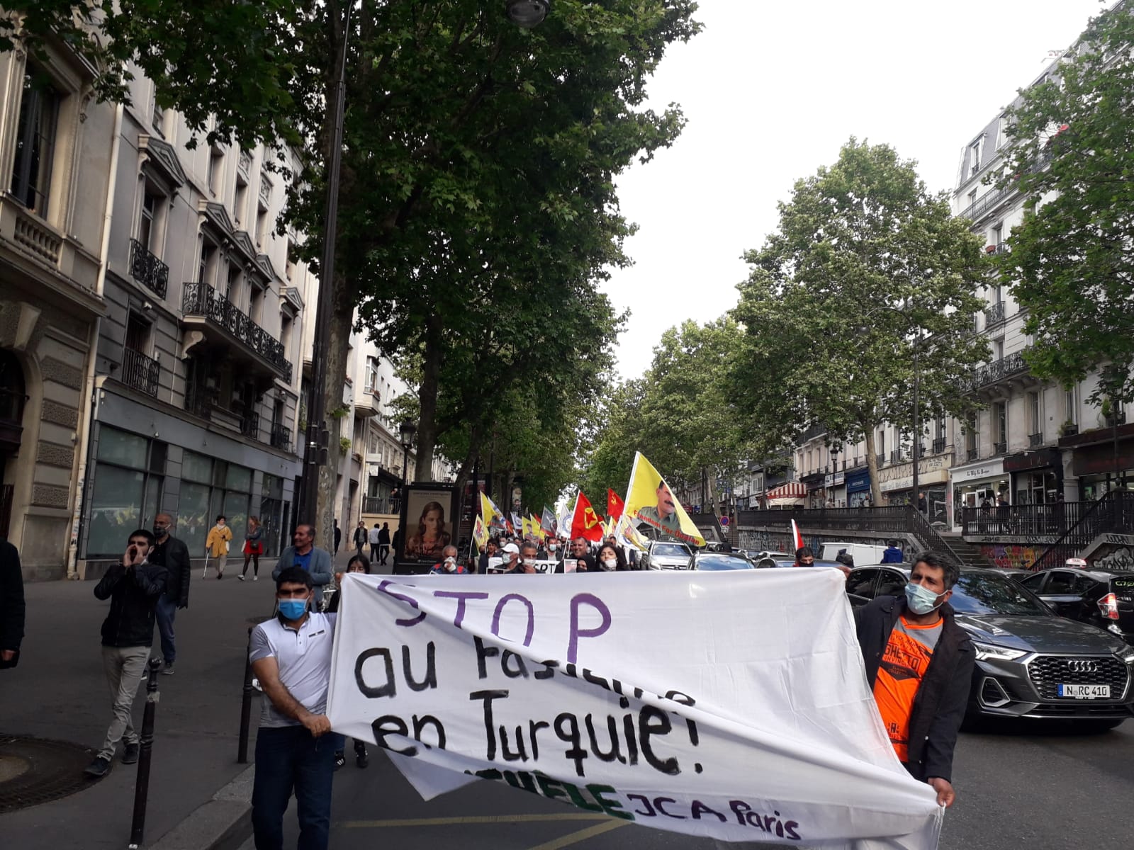 KCDK-E’nin çağrısıyla TCŞ ve JCA’nın öncülüğünde saat 19’da Paris République meydanında toplanan yaklaşık 1000 Kürdistanlı buradan yürüyüşe başladı. En önde Fransızca “Türk faşizmini durdur!” yazılı pankart ile başlayan yürüyüşte Halklar Önderi Abdullah Öcalan’ın posterleri, KCK ve PKK flamaları taşındı. Faşist AKP-MHP ittifakının HDP’li siyasetçilere dönük siyasi soykırım operasyonlarının protesto edilmesinin yanı sıra Ankara’da ırkçılar tarafından Kürtçe müzik dinlediği için vahşice öldürülen Barış Çakan da anıldı.
